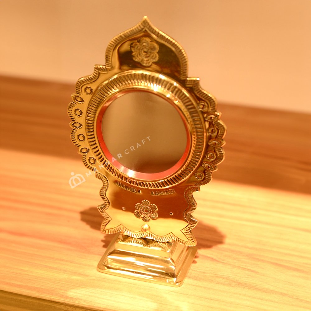 | Bring a touch of Kerala's heritage to your home with this exquisite Aranmula Kannadi mirror. This handcrafted metal mirror features a 3-inch reflecting surface and stands at an elegant 8 inches tall. Ideal for home decor or gifting for housewarmings, weddings, and more. Customization available! |
