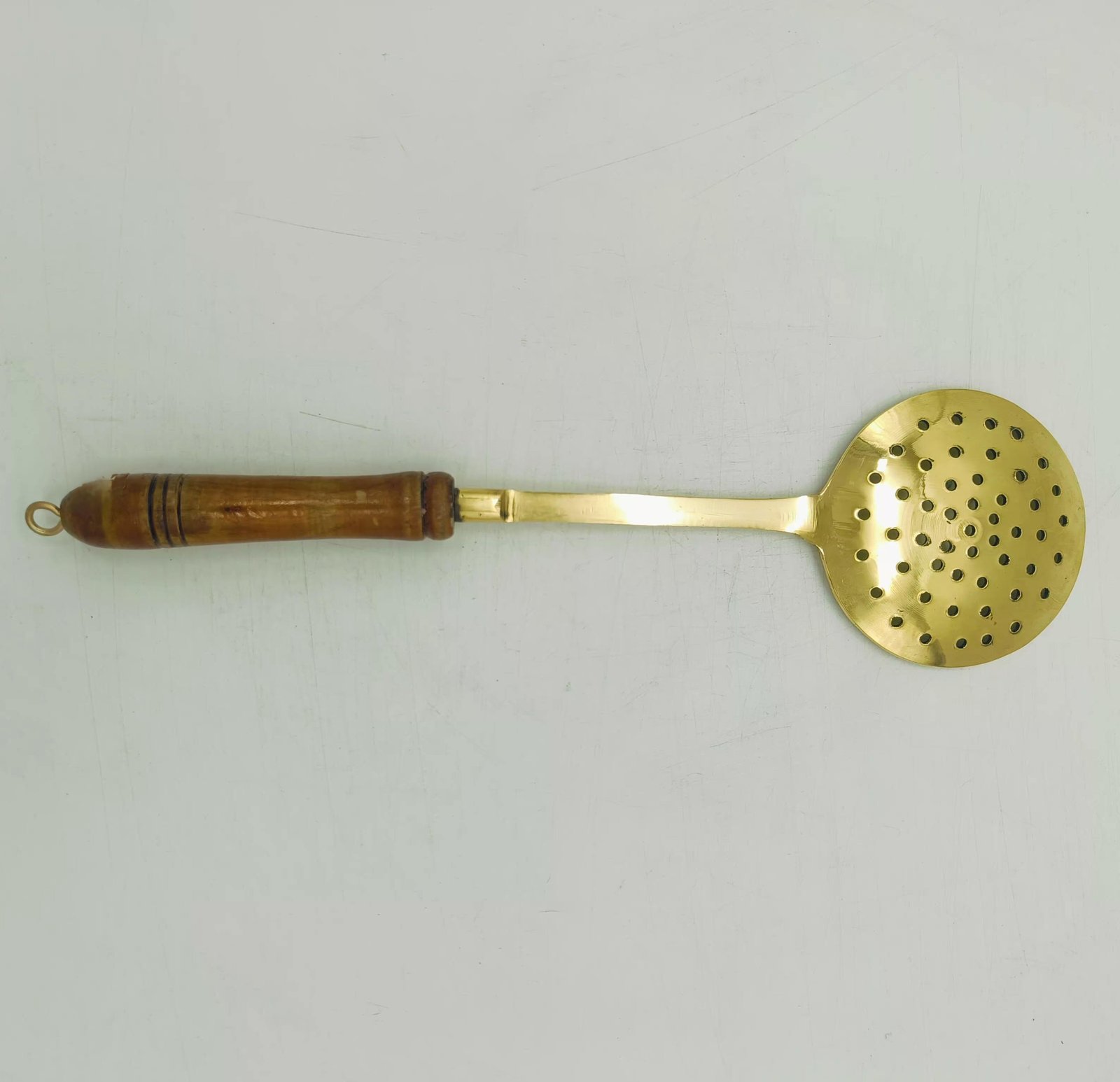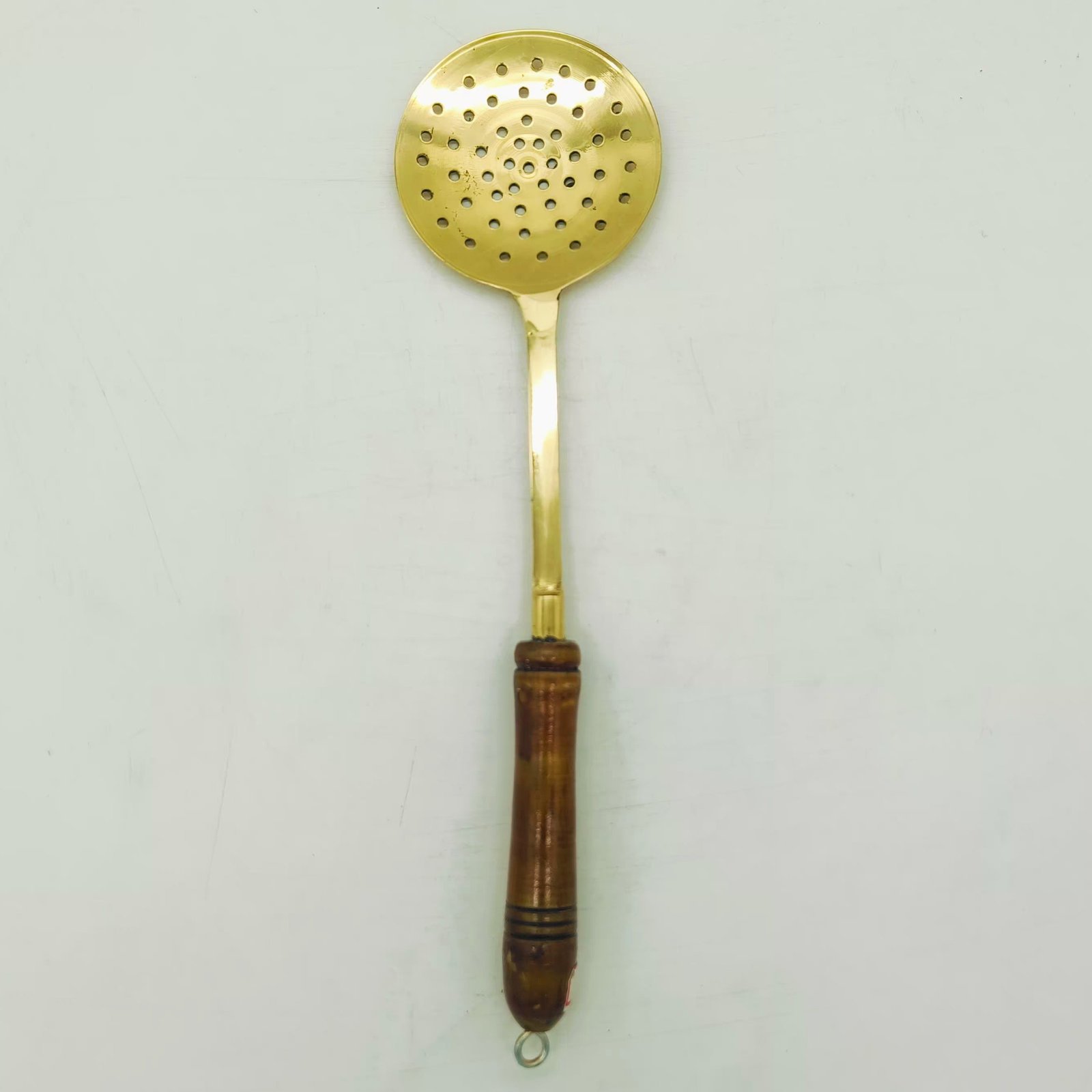 Handcrafted brass cooking ladle with sturdy wooden handle — antique-style frying and serving spoon, perfect for traditional Indian kitchen use.