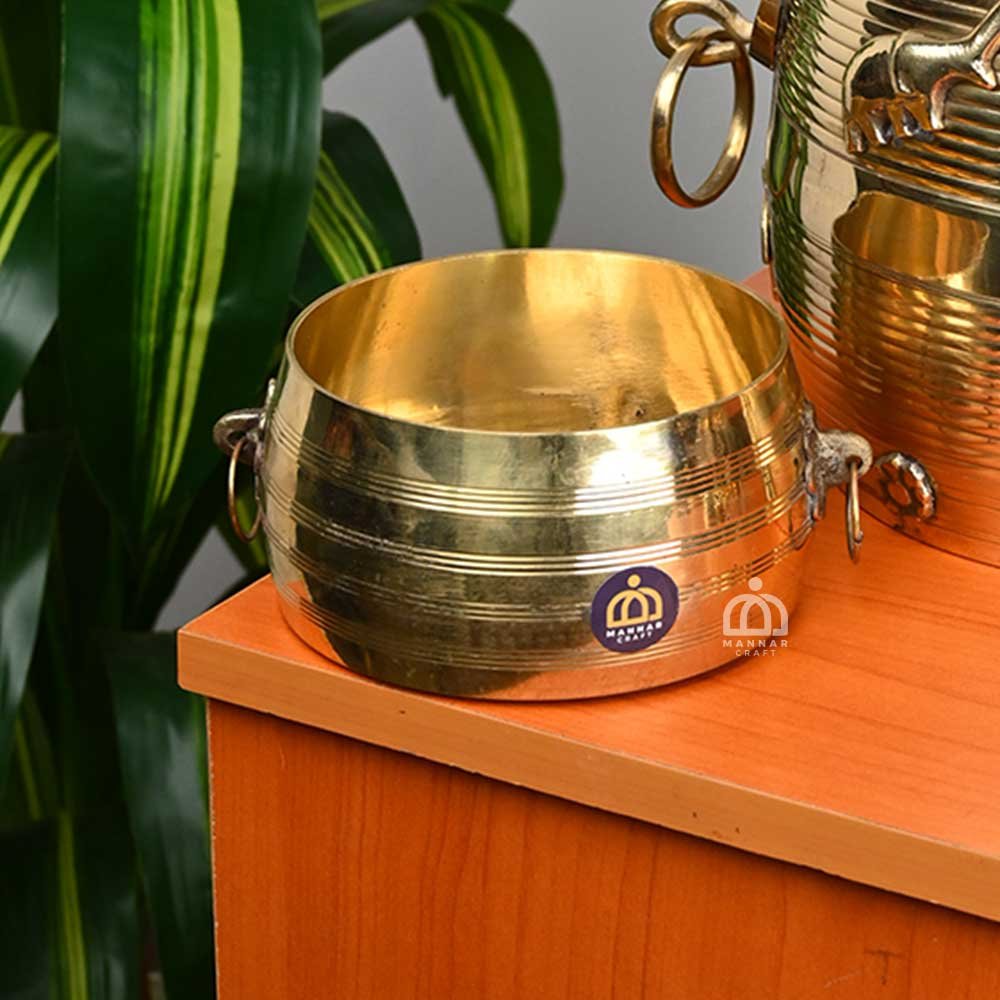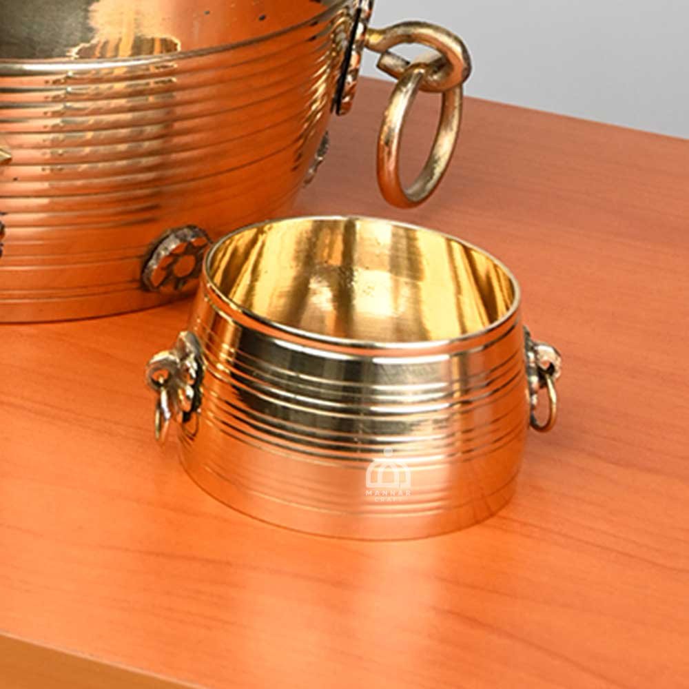 Elegant Brass Design Para with Changazhi and Nazhi – a handcrafted Kerala measuring vessel set symbolizing prosperity. Perfect for pooja rituals, festive décor, and gifting and fine detailing.