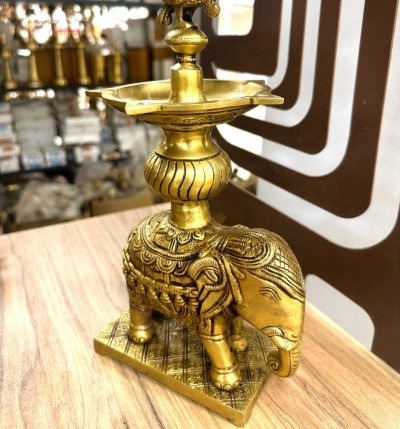 Crafted from premium solid brass, this unique diya holder features an intricately designed peacock lamp resting on an elephant base, making it both functional for lighting rituals and a decorative masterpiece for your home. Its heavy and durable structure ensures lasting shine and elegance.