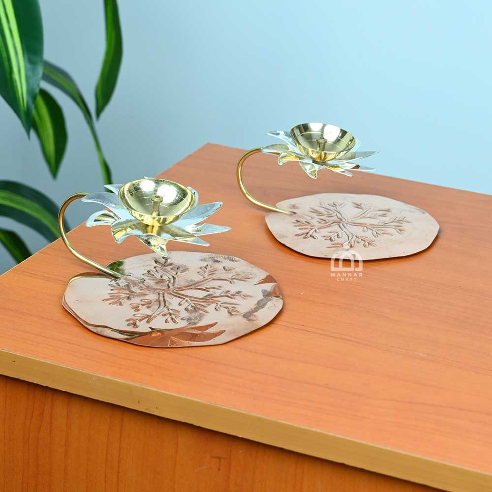Enhance your sacred space with the Brass Lotus Diya Holder from Mannar Craft. Designed as a lotus flower, this exquisite diya combines silver and gold tones with a copper-colored embossed base, creating a visually striking centerpiece for any home altar or temple.