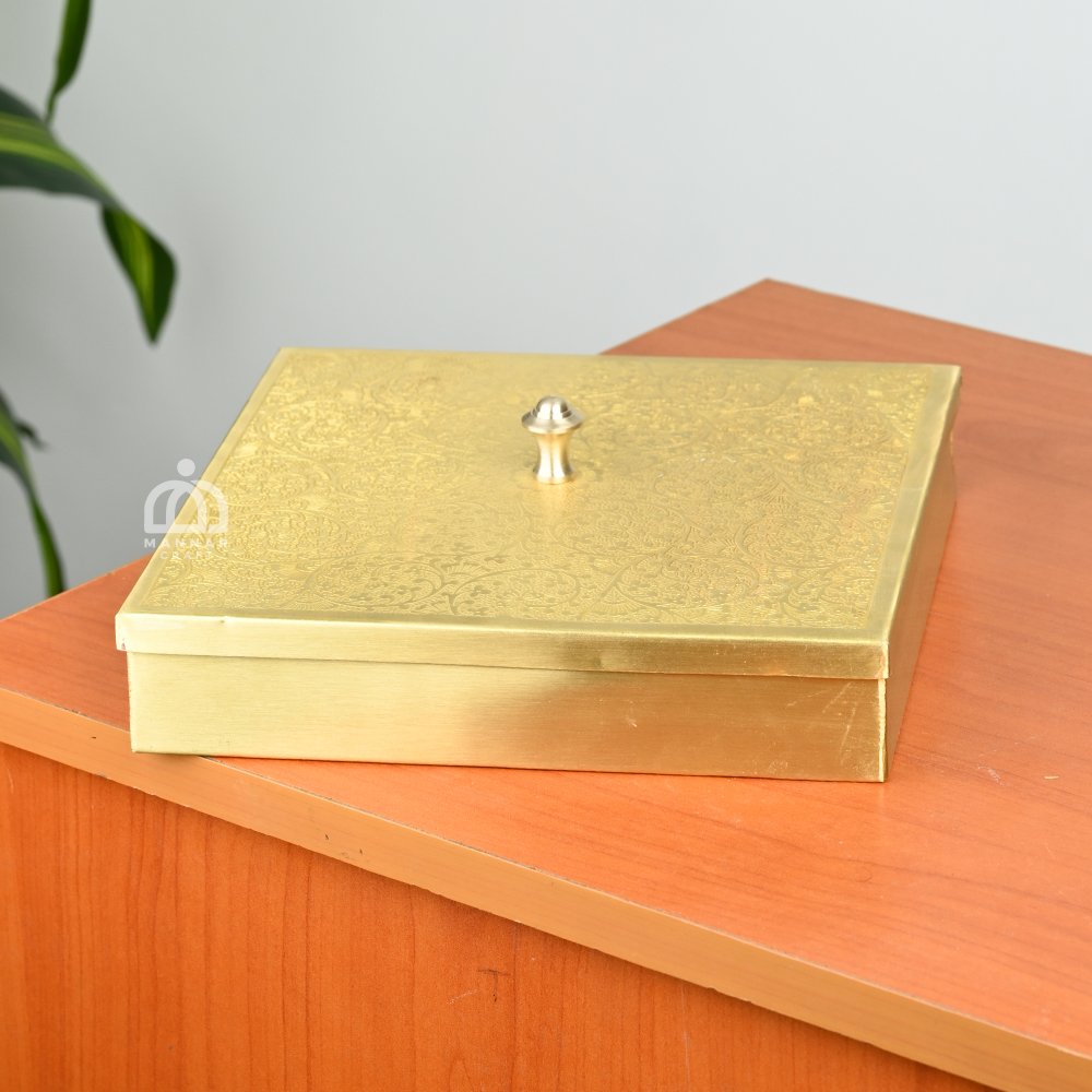 Elevate your kitchen with this pure brass floral square masala dabba. Featuring 9 containers and a spoon, it blends traditional elegance with everyday practicality perfect for storing spices beautifully and safely.