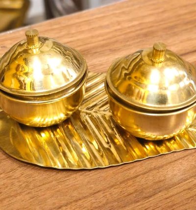 Set of 5 Brass Kumkum Boxes – Designed with a neem leaf base and twin containers with lids.