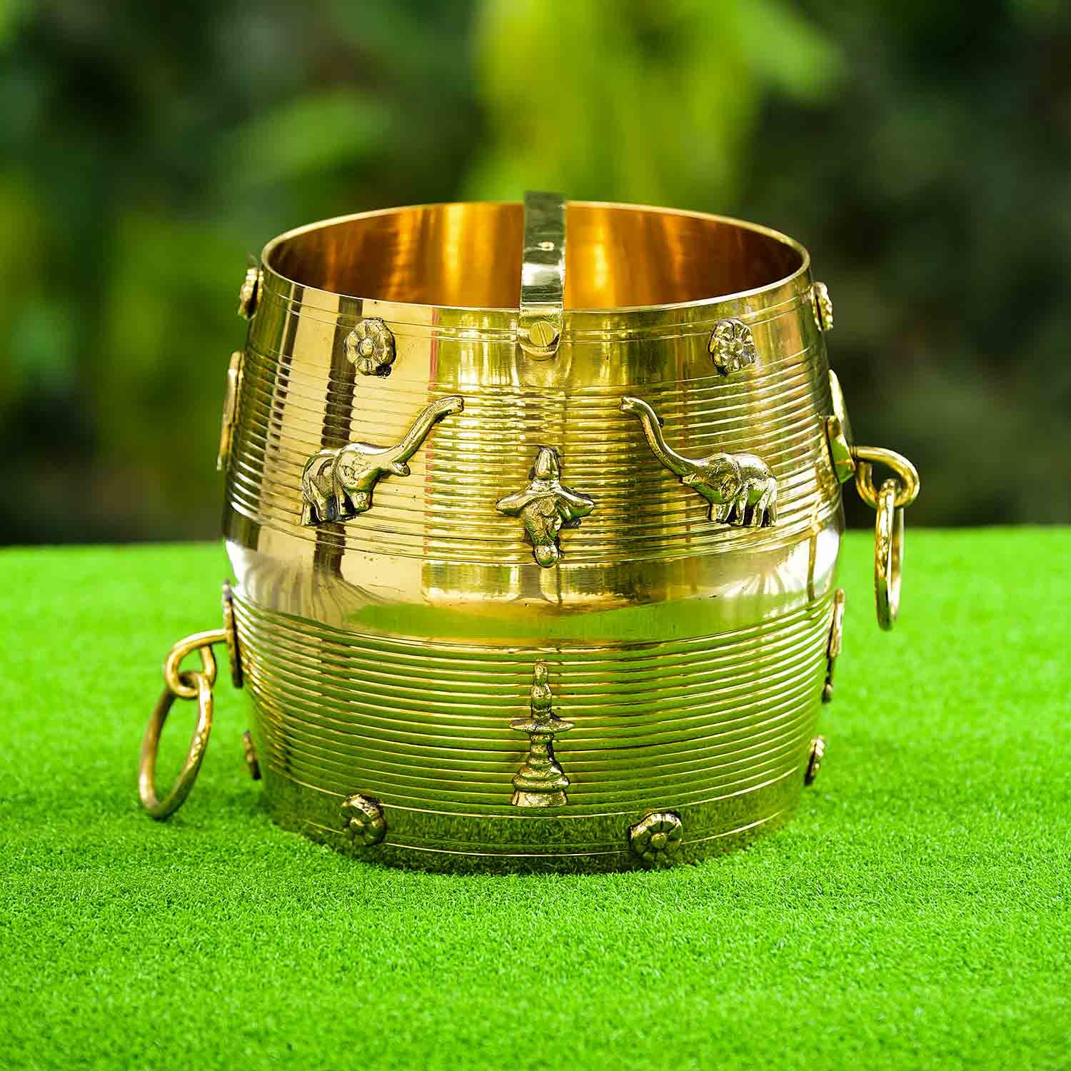 This traditional Brass Para is a beautifully crafted measuring vessel, originating from the rich cultural heritage of Kerala, India. This brass para is designed for both home decor and traditional rituals. It is the perfect choice for anyone who wants to add a touch of tradition to their home. With its intricate design and rich brass finish, this measuring vessel will make a stunning addition to any room. It is an excellent choice for storing and measuring rice, grains, and spices in traditional kitchens. Use it to add a touch of history to your cooking, or as a timeless piece of decor in your home. This brass para is a must-have for those who appreciate the authentic, traditional artistry of India.