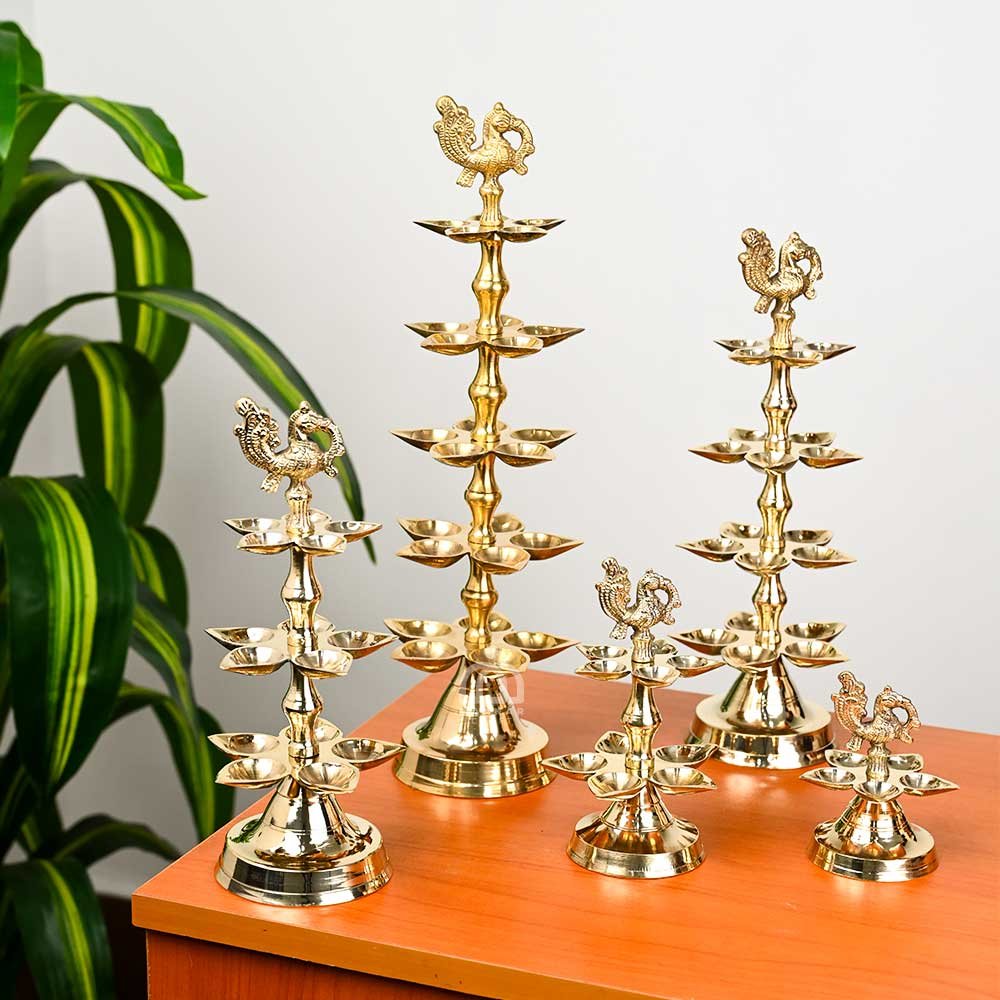 Handcrafted brass peacock diya from Kerala featuring layered design for multiple wicks. Ideal for pooja, temple rituals, festive décor, and auspicious gifting. Durable, radiant, and spiritually symbolic.