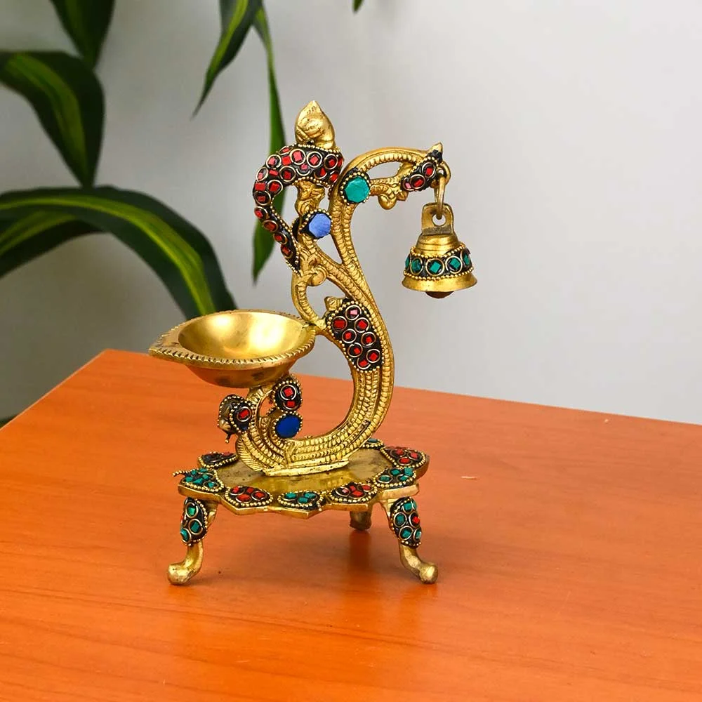 Golden Peacock Designer Brass Diya with Bell & Stand
