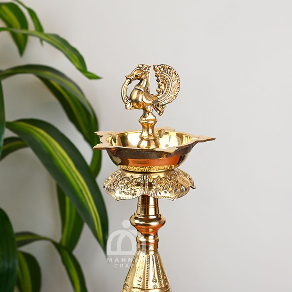 Its polished golden shine and intricate detailing reflect skilled artistry, while the solid base ensures durability and stability. This brass peacock lamp is also a thoughtful gift choice for housewarming, festivals, and spiritual occasions.