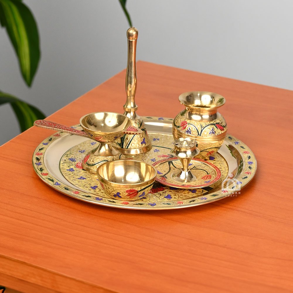 Celebrate tradition and spirituality with the Mannar Craft Brass Pooja Thali Set with Red Flower Design in Velvet Gift Box. Expertly handcrafted from premium brass, this pooja thali is designed with a beautiful red flower pattern that symbolizes prosperity and positivity. Its polished finish enhances the shine, making it perfect for both daily rituals and festive occasions. The set comes elegantly packed in a velvet gift box, making it not only convenient to store but also an ideal choice for gifting during weddings, housewarming ceremonies, Diwali, and other festivals. Compact yet spacious, this brass thali is perfect for holding diya, incense, kumkum, and other puja essentials. A timeless piece of devotion, this pooja thali from Mannar Craft blends traditional design with cultural elegance, making it a must-have for every spiritual home.
