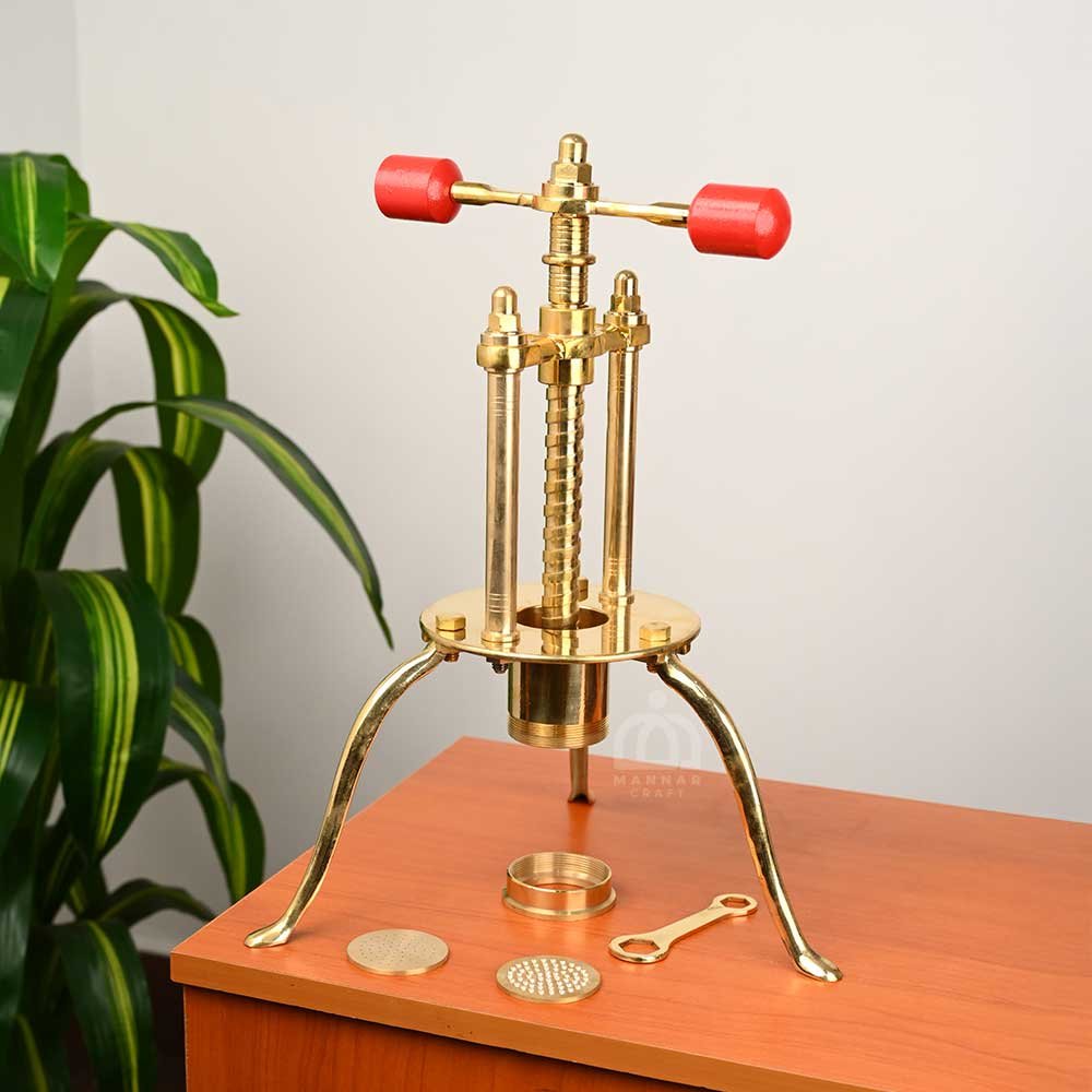 Mannar Craft brings to you, Sev Sancha with 3 legs, made of brass. This sevanazhi comes with two jalis for making different-shaped food items. Also called the String Hopper or Kaal sevanazhi, it can be used as an idiyappam maker, ricesev maker, farsan sev maker or noodles maker. It has a detachable base, making it easy to remove and clean. This brass sevanazhi is the perfect addition to give a traditional twist to your kitchen.