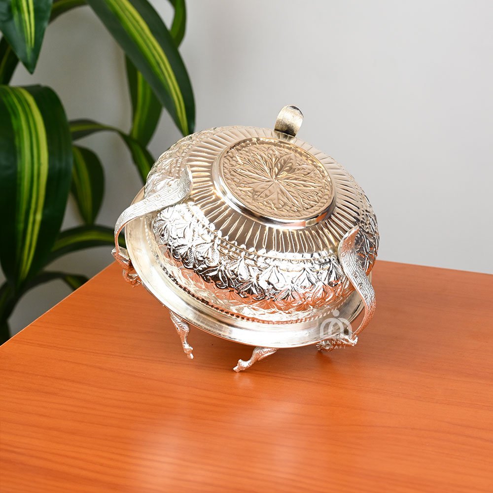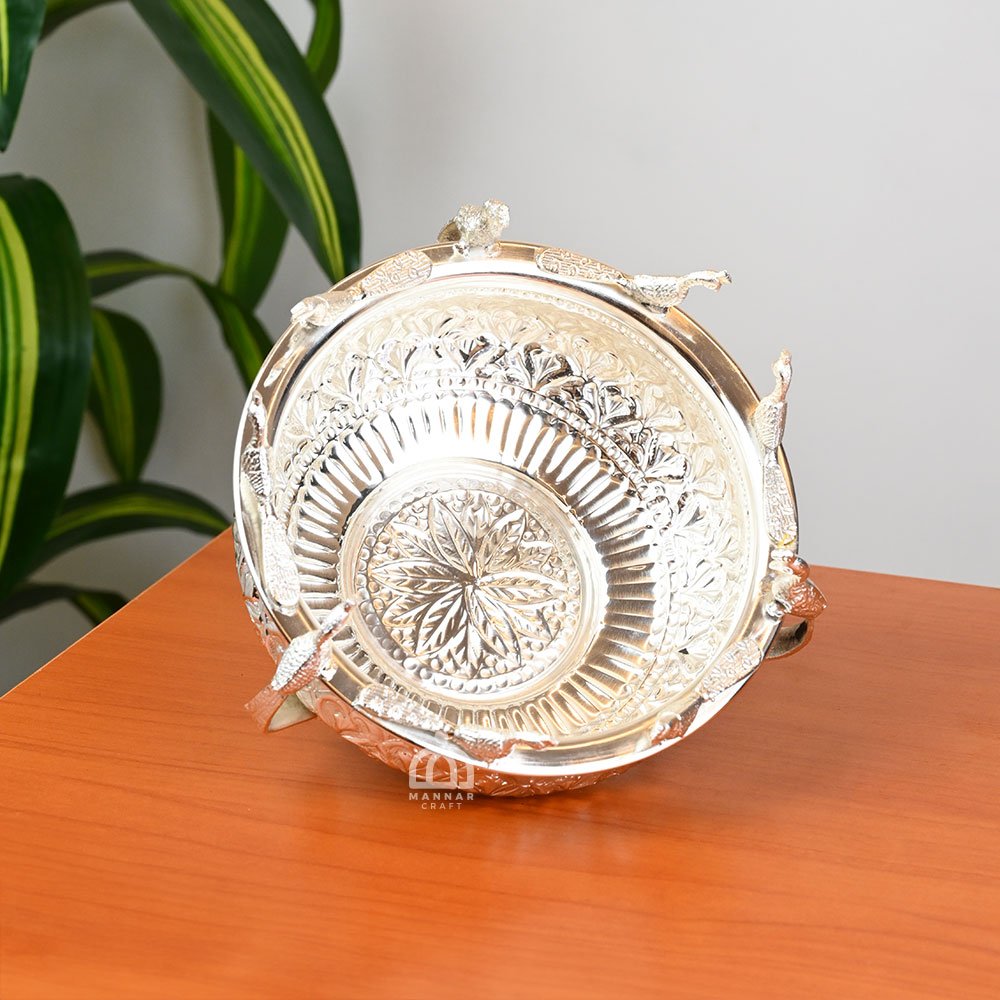 With its radiant silver shine and intricate peacock detailing, this uruli is a perfect blend of spirituality, artistry, and elegance—making it a thoughtful gift for loved ones or a cherished addition to your own collection.