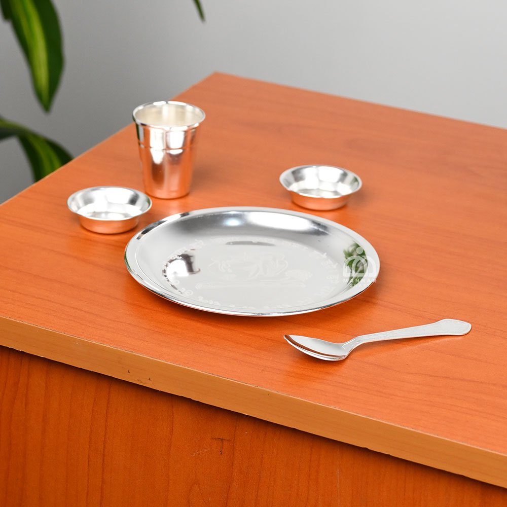 Complete Small Pooja Thali Set: Includes 1 thali (plate), 2 bowls, 1 spoon, and 1 glass for rituals.