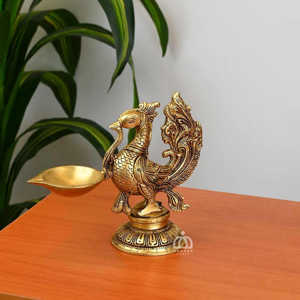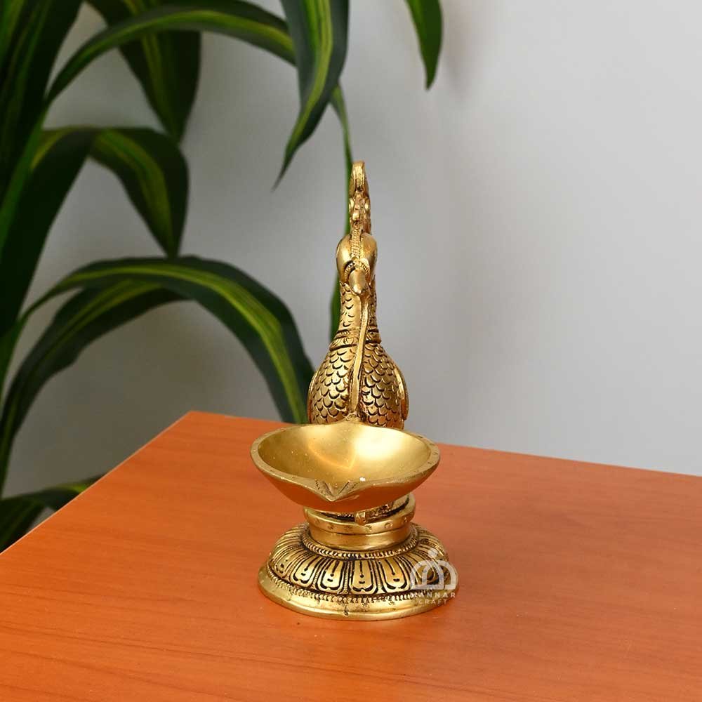 The intricately carved peacock holds a traditional diya (lamp), symbolizing prosperity, grace, and positive energy in Indian culture. Made from premium solid brass, it ensures durability while adding a touch of luxury to your home.