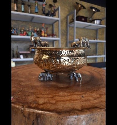 The Decorative Uruli with Elephant Design from Mannar Craft is a stunning piece of art that will elevate the ambiance of any space. This uruli is handcrafted by skilled artisans using traditional techniques, making it a unique and exquisite addition to your home decor.