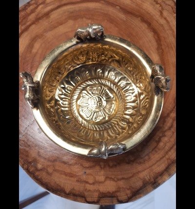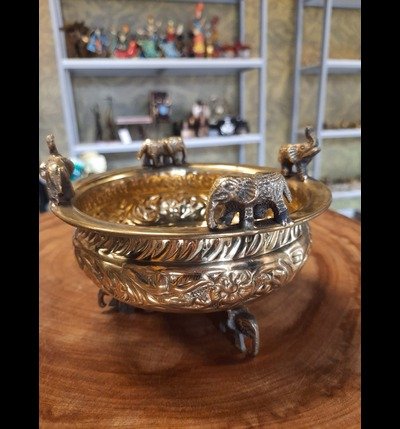 The uruli is made of high-quality brass sheet that has been polished to perfection, giving it a lustrous and elegant finish. The highlight of this uruli is the intricate elephant design that has been engraved on the surface. The elephant is a symbol of strength, power, and wisdom, making it a popular motif in traditional Indian art.