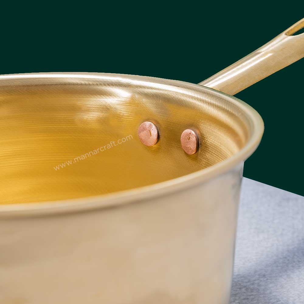 Experience superior heat distribution and exceptional cooking with our traditional Bronze Sauce Pan. Perfect for everyday tasks like boiling milk, making tea or coffee, and simmering delicious soups.Crafted from high-quality bronze, this pan boasts unmatched durability and even heat distribution for perfectly cooked results every time. Its thick walls ensure gentle simmering and prevent hot spots. Elevate your kitchen experience with this versatile and beautiful bronze saucepan. Ideal for those seeking a healthy and traditional cooking method.