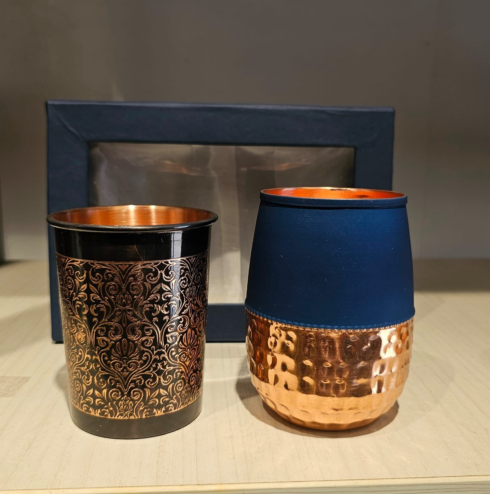 Premium copper design glass set combo featuring one Silk Model glass and one Antique Engraved glass. Perfect for Ayurvedic water drinking, home décor, and gifting.