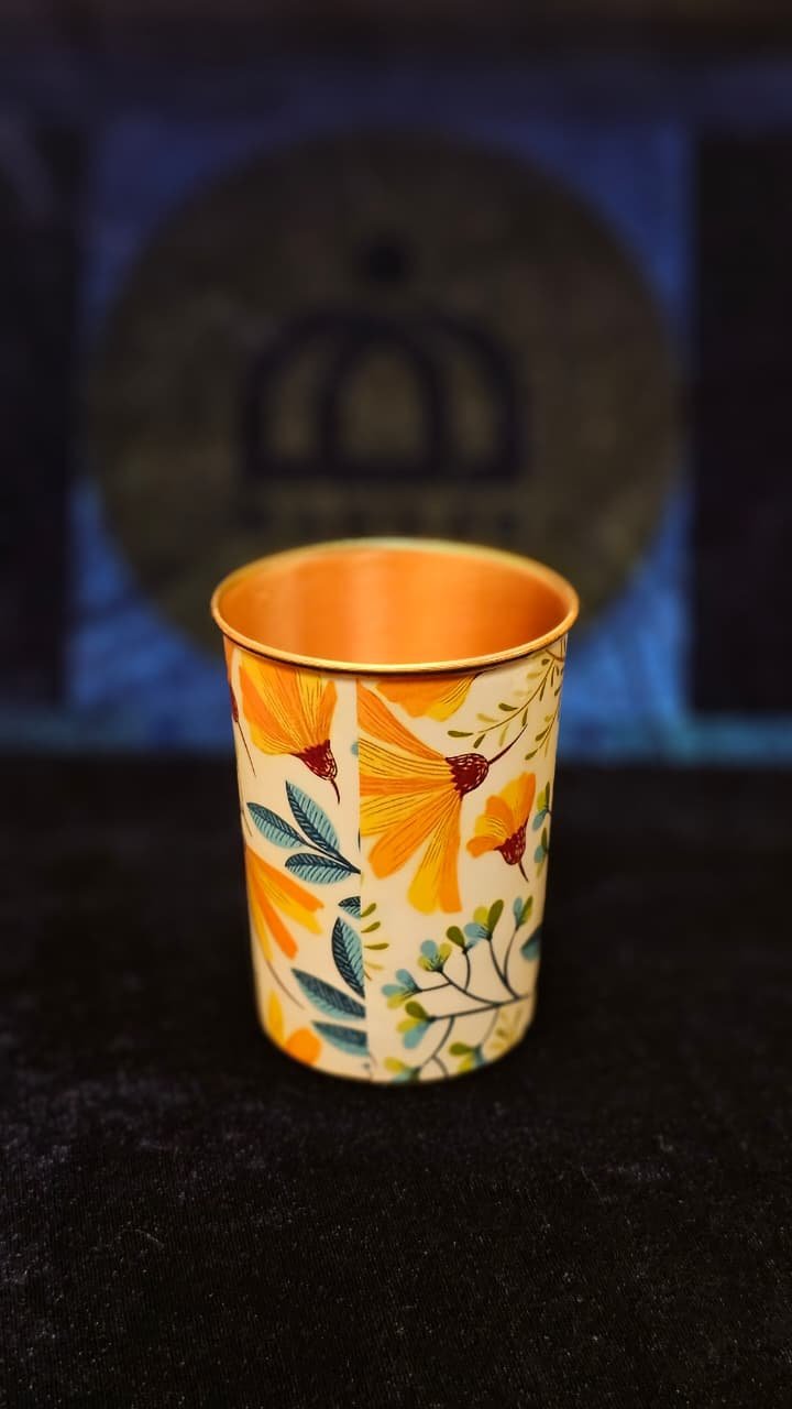 Elegant copper glass with vibrant yellow floral design. Ideal for water drinking, daily use, and gifting. A perfect blend of health benefits and traditional artistry for your home.