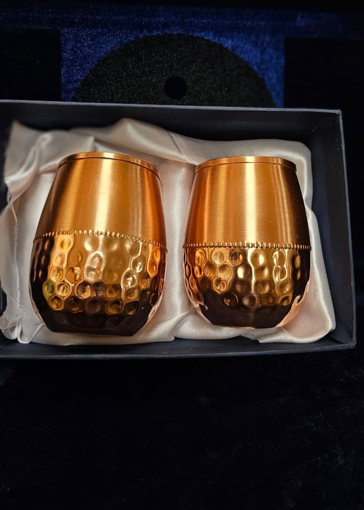 Elegant copper hammered glass set of 2 designed for healthy living. Perfect for Ayurvedic water storage, daily hydration, and premium gifting. Durable, stylish, and rooted in tradition.