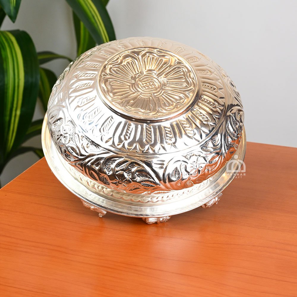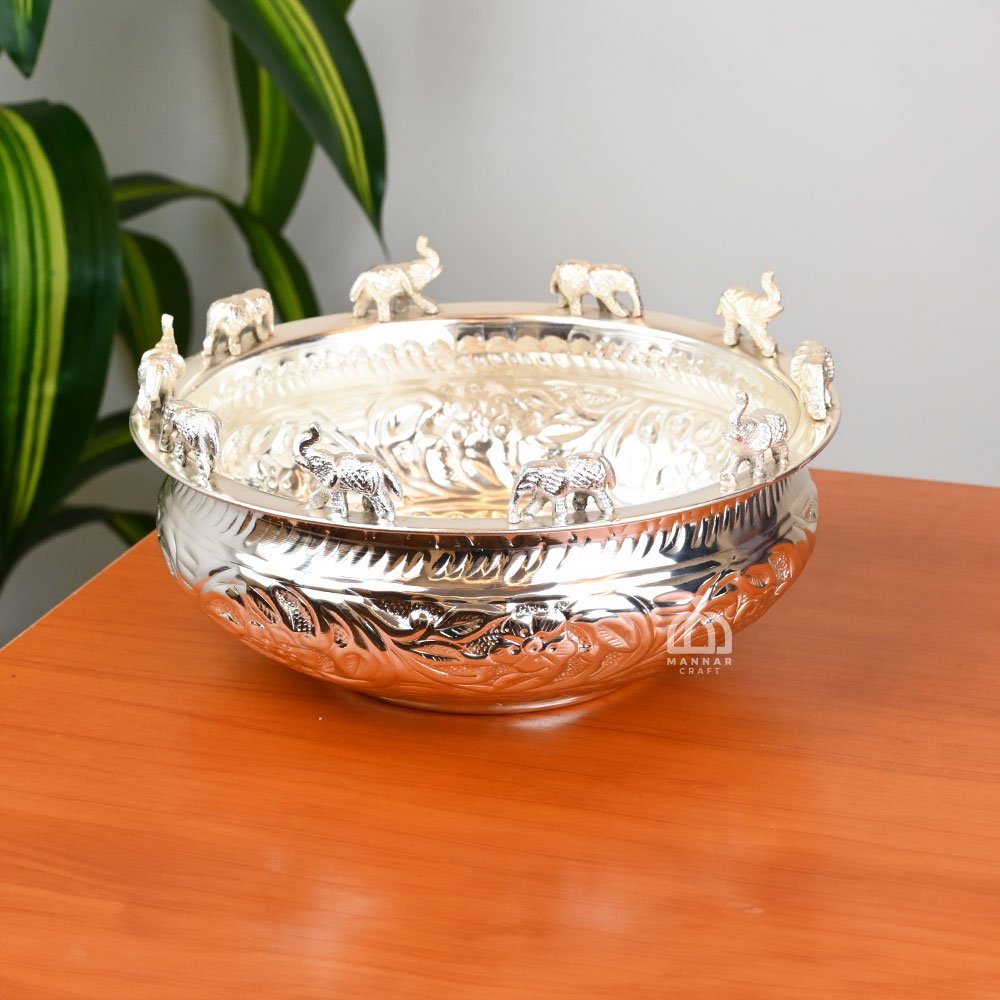 Premium 10 inch silver coated brass uruli with intricate floral design