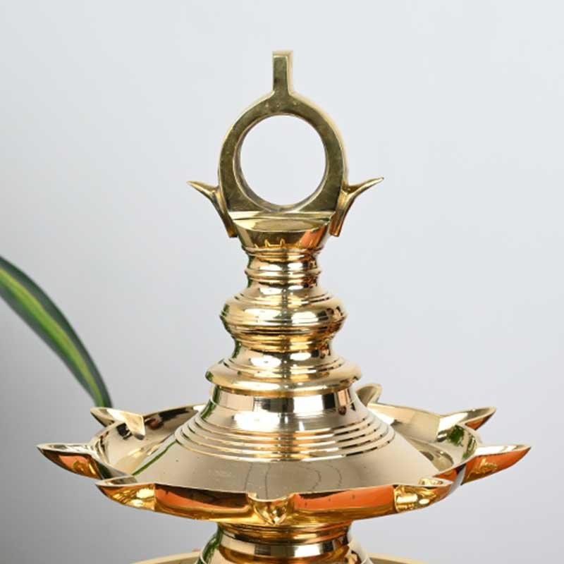 Illuminate your space with this Elegant Brass Oil Lamp, a stunning 9-faced hanging diya handcrafted by skilled artisans. Each face holds a flame, symbolizing prosperity and positivity, making it ideal for pooja rooms, festive décor, or elegant interiors.