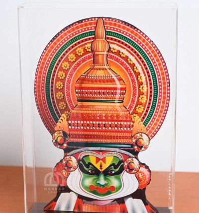 Elegant printed Kathakali face in a sleek glass display case