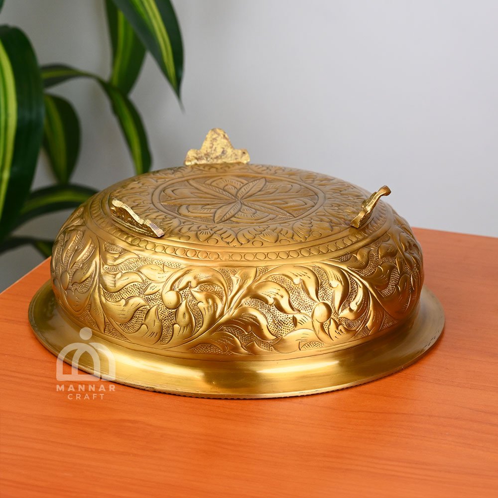Beautifully handcrafted Floral Embossed Brass Uruli – a traditional Kerala decorative bowl perfect for pooja rooms, festive decor and centerpieces. Made from premium-quality brass with intricate floral detailing and antique finish.