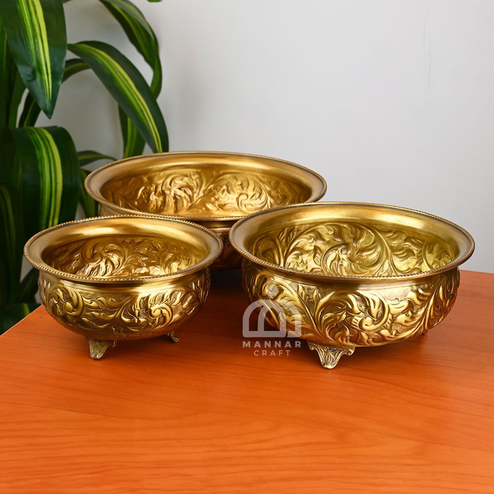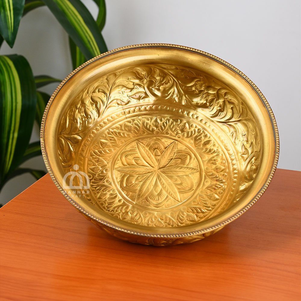 Enhance your home decor and spiritual space with the Handcrafted Brass Uruli Decorative Bowl from Mannar Craft. This traditional brass uruli is adorned with intricate hand-embossed floral patterns on both its interior and exterior, creating a textured, ornamental charm that adds elegance to any space.
