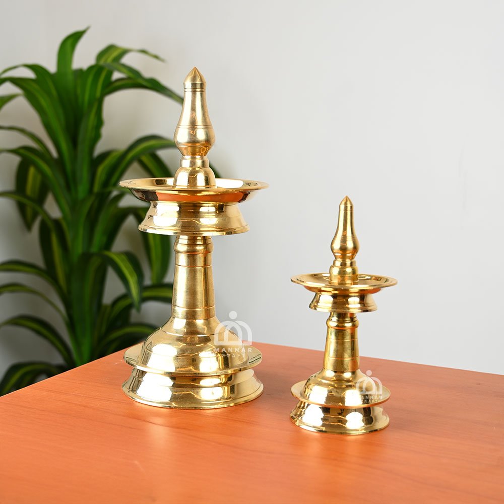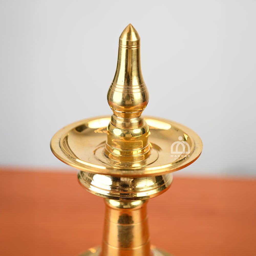 Bring the serenity of temple prayers into your home with this exquisite Ganapathi Vilakku, a handcrafted brass oil lamp. This traditional Nilavilakku features intricate designs. Fill your temple, pooja room, or living space with the warm glow of calming lights, perfect for meditation and relaxation. Crafted from high-quality brass by skilled artisans in Kerala, this lamp is a stunning addition to your décor and makes a meaningful gift for weddings, housewarmings, or any special occasion.