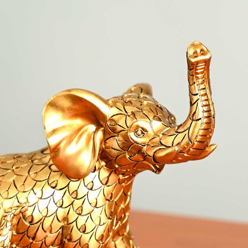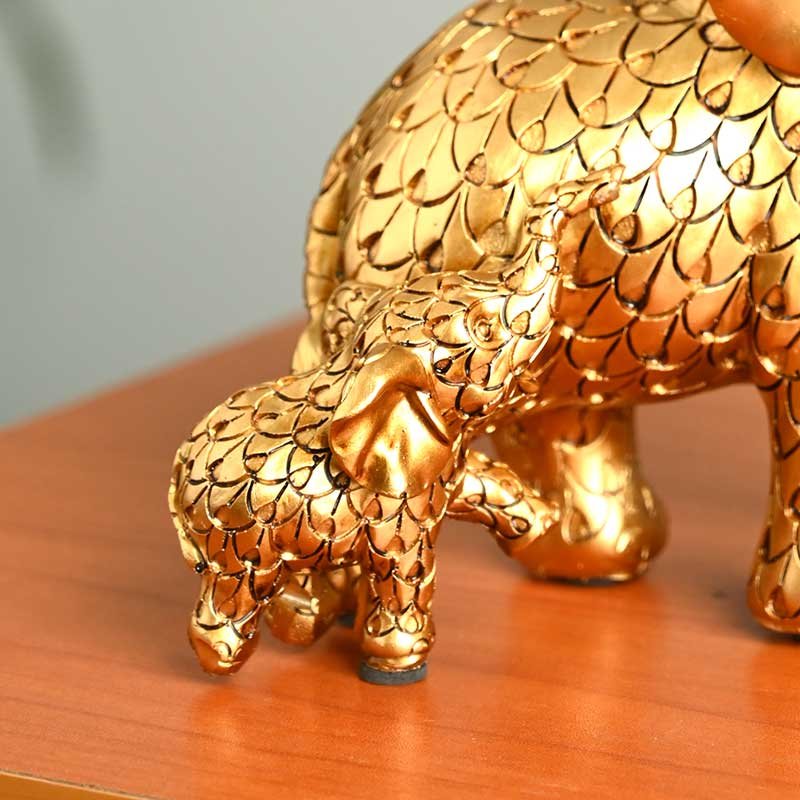 Designed with intricate detailing and a rich metallic gold finish, this showpiece captures the graceful bond between a mother elephant and her calf. The raised trunks, a revered symbol in Vastu and Feng Shui, are believed to welcome good luck, success, and positive energy into your home.
