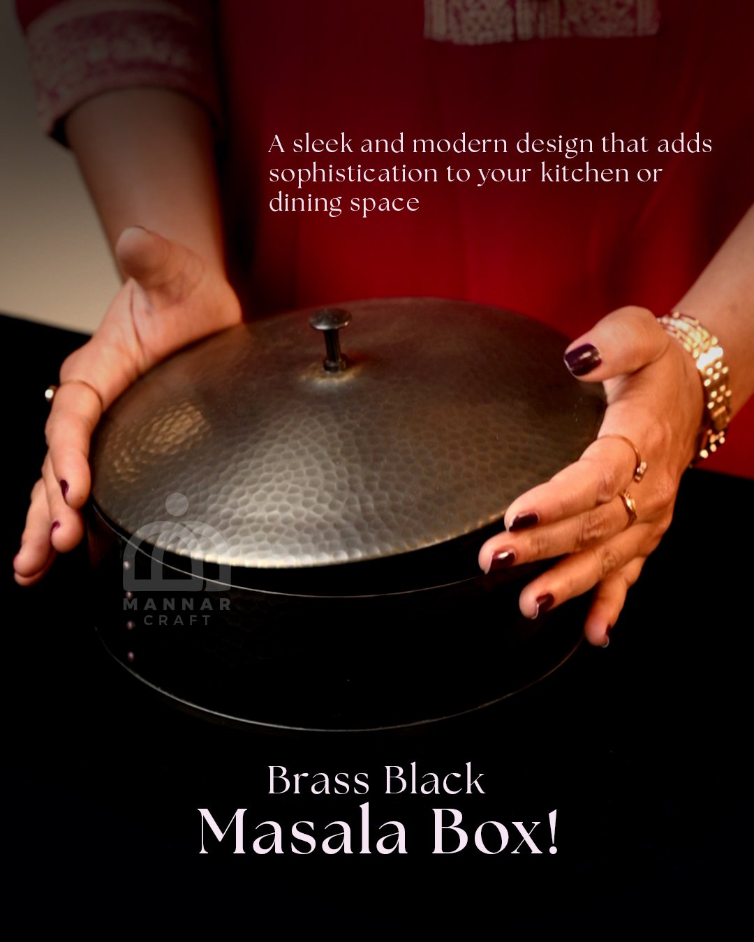 Elevate your kitchen aesthetics with this Handcrafted Black Masala Box with Lid. Perfectly sized at 7.5 inches in diameter, this elegant spice storage box comes with 7 individual containers and a convenient spoon, ensuring effortless access and organized storage of your favorite spices. Made with premium craftsmanship, it combines traditional design with modern functionality, making it an essential addition to any home. Whether for daily cooking or special occasions, this masala box brings style and practicality to your culinary space.