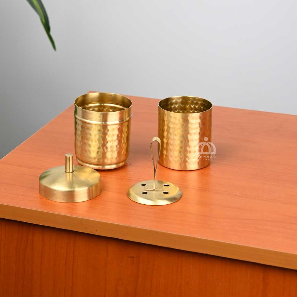 Brew rich, aromatic South Indian filter coffee with this handcrafted brass coffee filter. Designed with a hammered matt finish and 2-cup capacity, it offers durability, elegance, and authentic flavor in every cup.