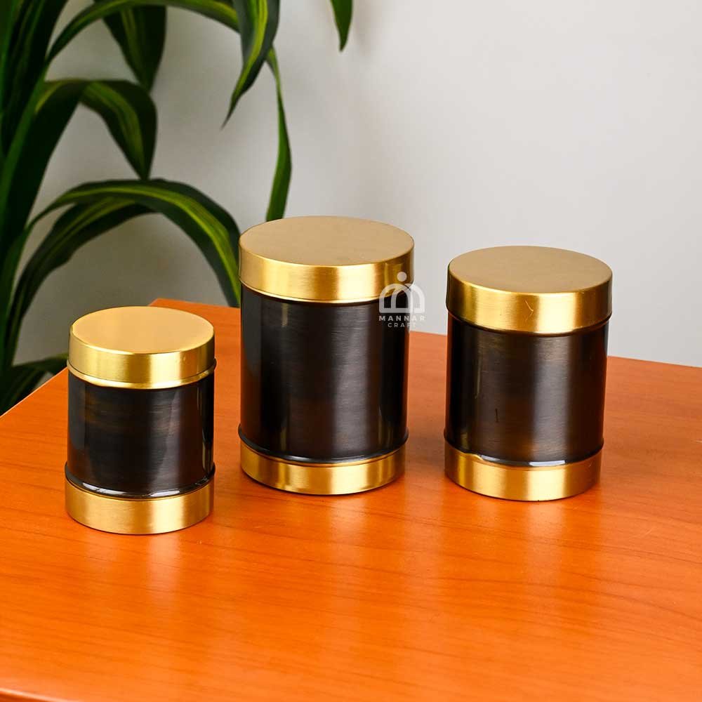 - Set of 3 Premium Brass Storage Boxes – Perfect for storing flour, spices, pulses, and more.