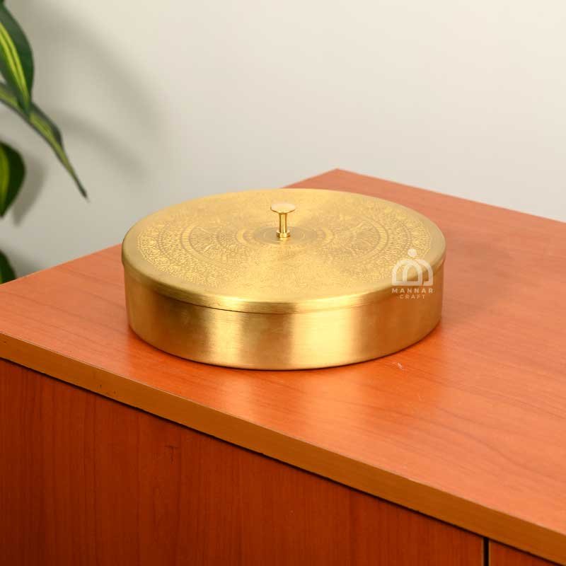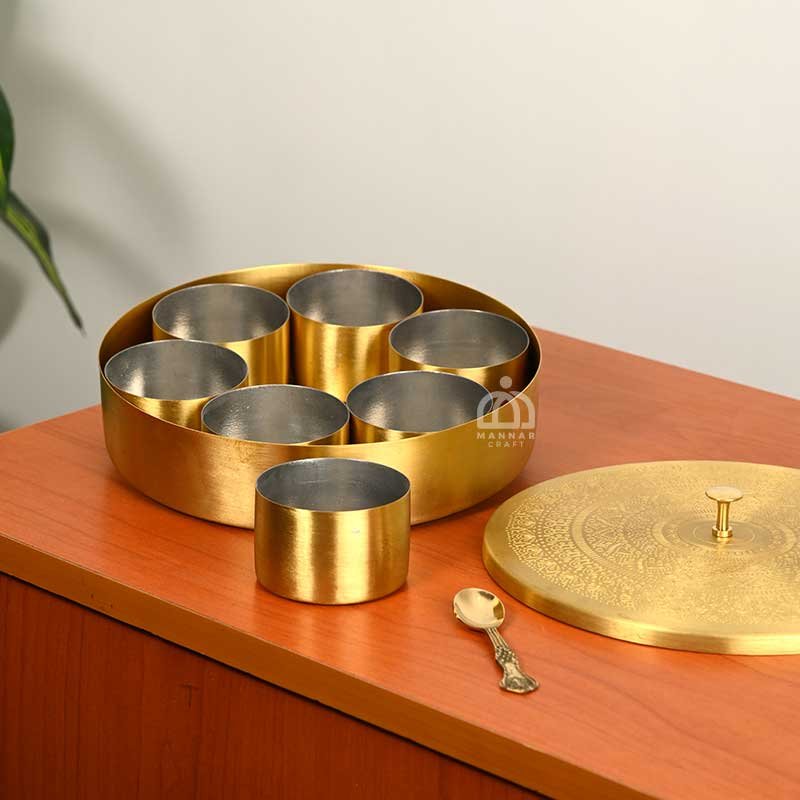 - Handcrafted Brass Masala Daani: Skillfully designed with intricate etching for a traditional, elegant look.