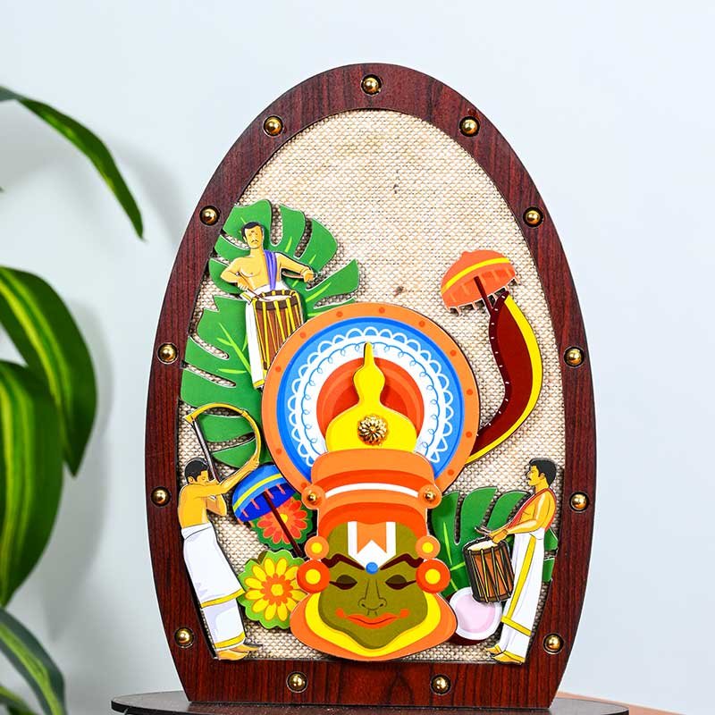 Celebrate Kerala’s vibrant cultural heritage with this handcrafted Kathakali Wooden Memento by Mannar Craft. This unique art piece beautifully depicts the iconic Kathakali face, umbrella, palm leaves, and traditional Chenda Melam drummers, making it a true representation of Kerala’s classical traditions.