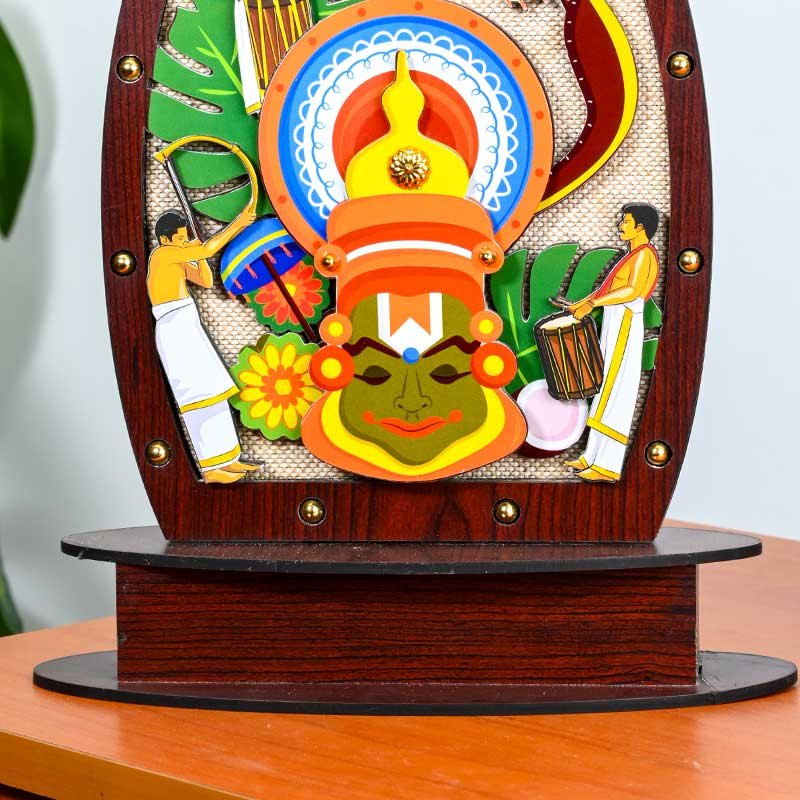 Exquisite Kathakali wooden memento showcasing Chenda Melam drummers and traditional Kerala decor. Handcrafted for cultural enthusiasts and as a unique gift or keepsake.