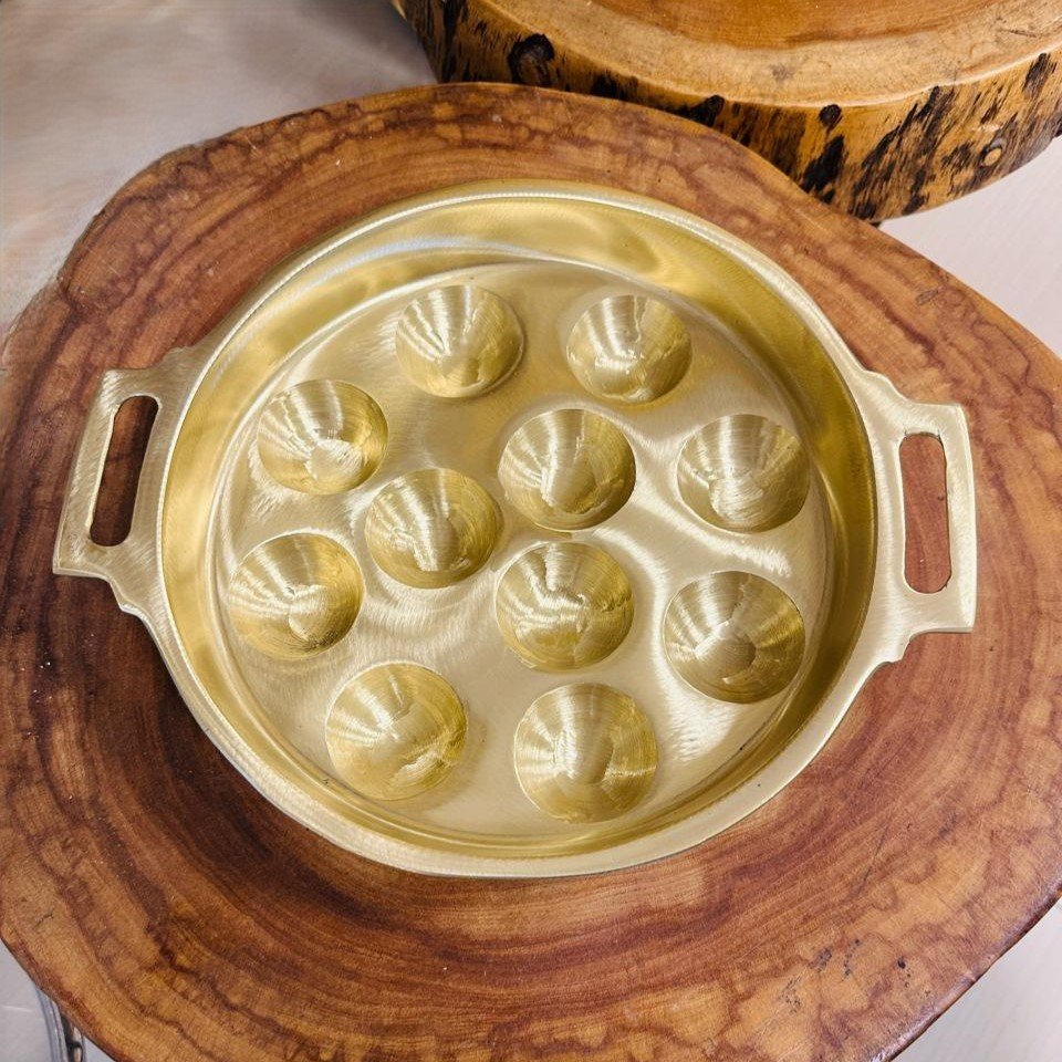 Traditional 10-inch handcrafted bronze paniyaram pan with 11 pits. Ideal for making soft and crispy appams. Durable, food-safe cookware for healthy cooking.