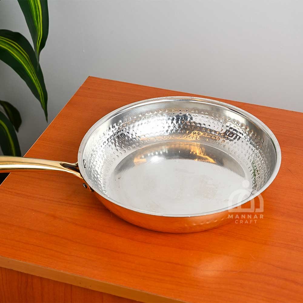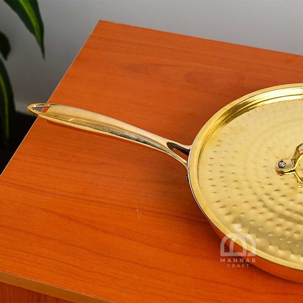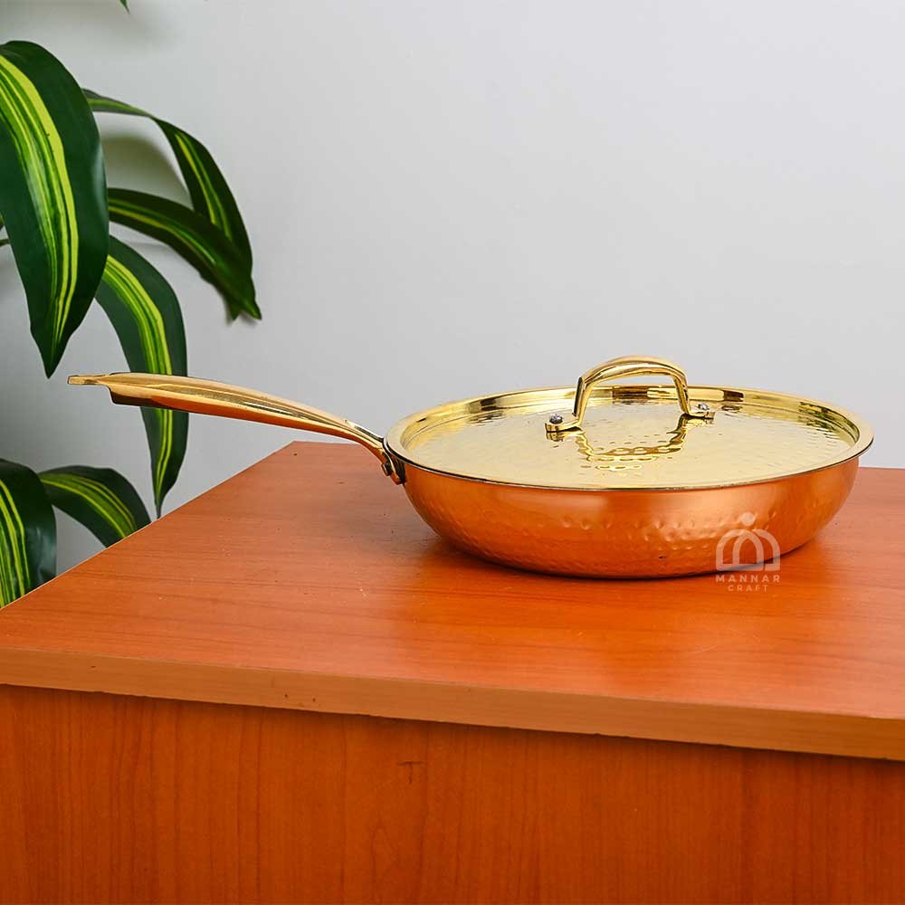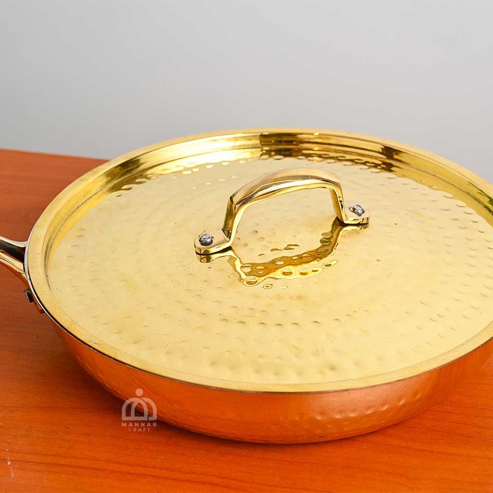 Pure handcrafted brass fry pan with hammered finish and tin-coated inner surface. Comes with a lid — ideal for traditional, healthy cooking.