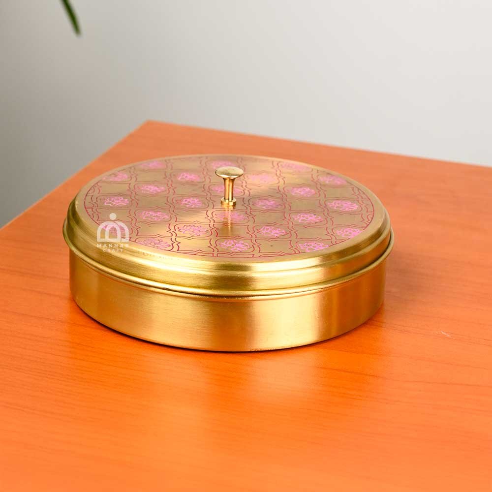 Bring tradition, elegance, and functionality to your kitchen with the Handcrafted Red Lotus Design Brass Spice Box by Mannar Craft. Beautifully etched with red lotus motifs, it reflects fine Indian craftsmanship and timeless charm.