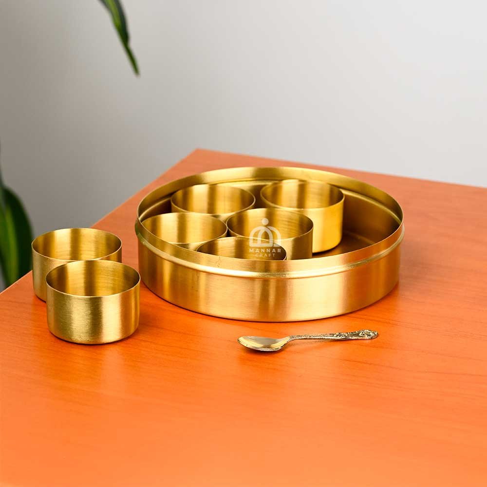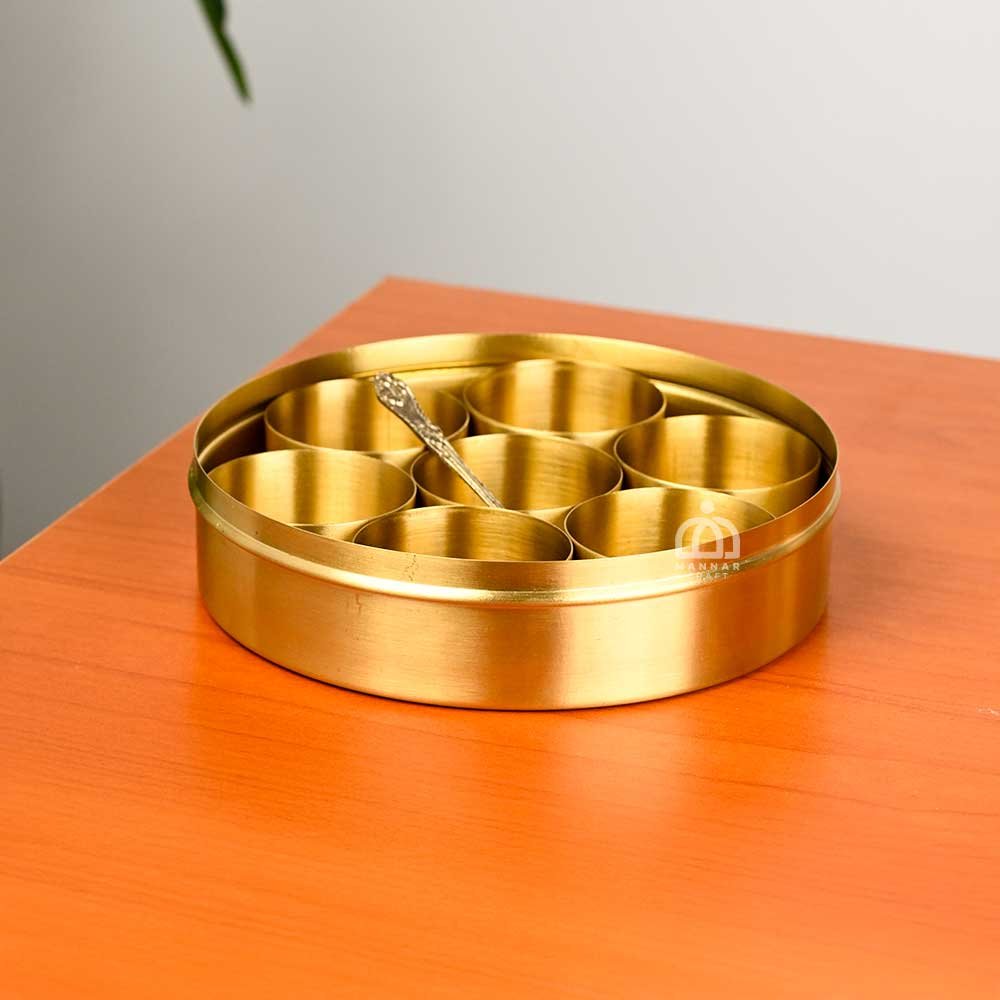 This spice box features 7 spacious compartments and a matching brass spoon to keep your spices neatly organized and fresh. Made from premium-quality brass, it’s durable, easy to maintain, and doubles as a decorative piece for your kitchen or dining area.