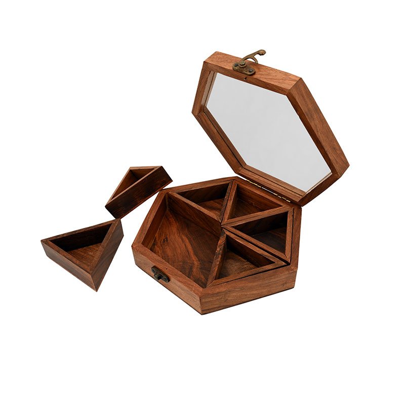 Organize your spices beautifully with Mannar Craft’s handcrafted hexagonal wooden spice box. A stylish and functional masala dabba perfect for everyday kitchen use and gifting.