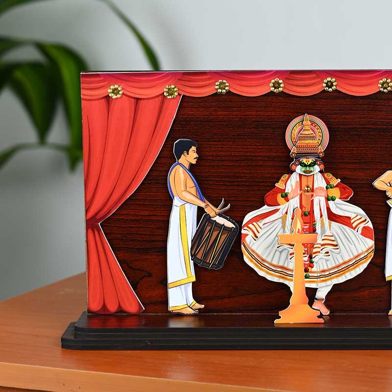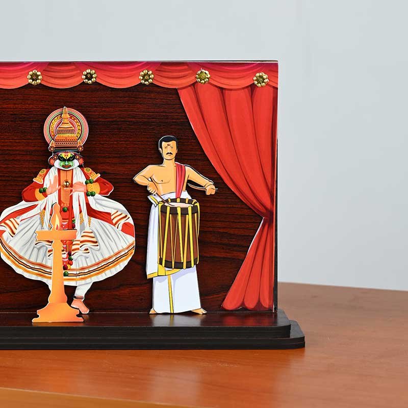 Bring the vibrant energy of Kathakali, Kerala's renowned classical dance form, into your home with this captivating figurine. printed on premium MDF wood, the figurine depicts a graceful Kathakali dancer amidst a stunning stage backdrop. The intricate details, vibrant colors, and expressive poses capture the essence of this unique art form.