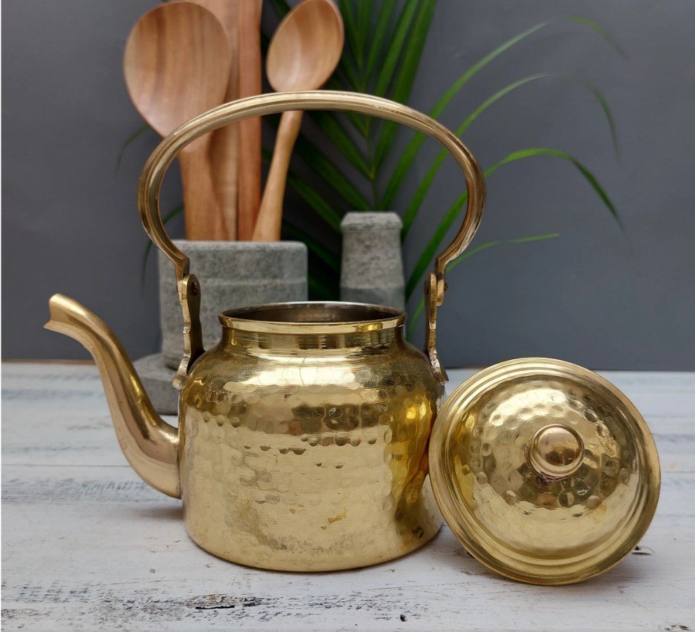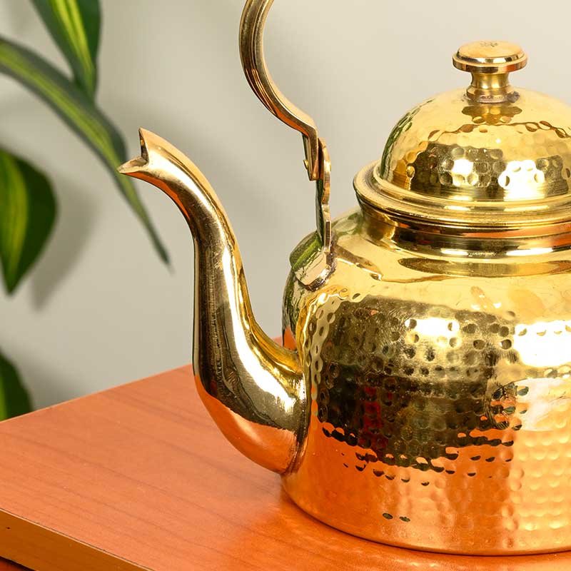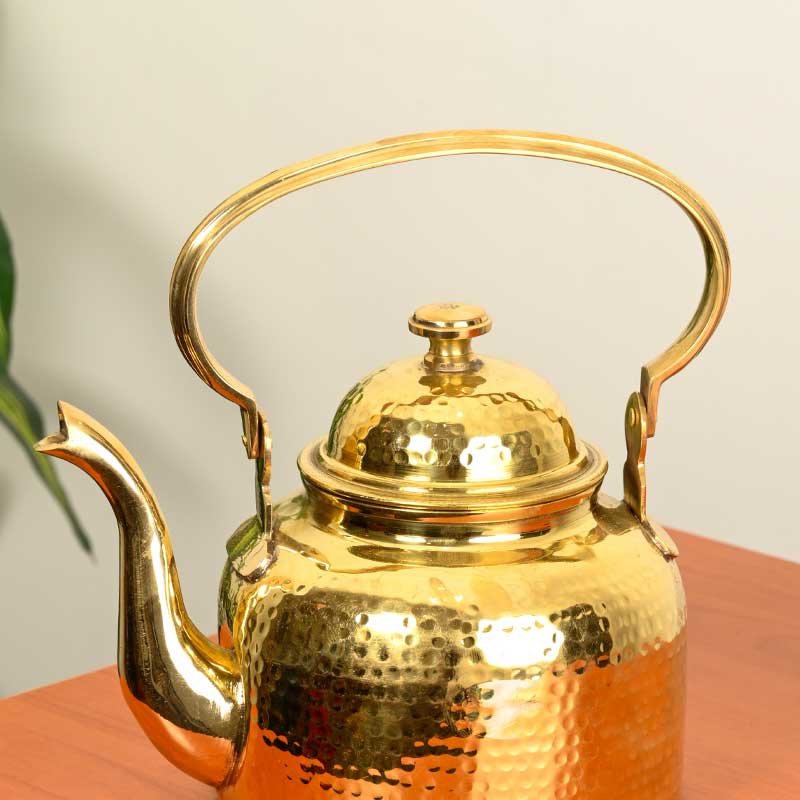 The mesmerising feel you get while pouring a cup of tea from the kettle , the hot steam that fills up your mind and the soothing aroma that lights up your mood is always unmatchable.Be it your morning coffee or the healthy green tea to detoxify your body, be it a refreshing lemon tea or everybody's favourite chai, every kind of tea's taste will now be enhanced as you serve them in this amazing brass kettle.The hand hammered Brass Kettle comes with Tin (Kalai) coating on the inside.