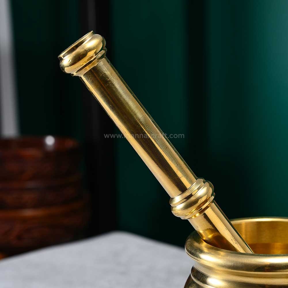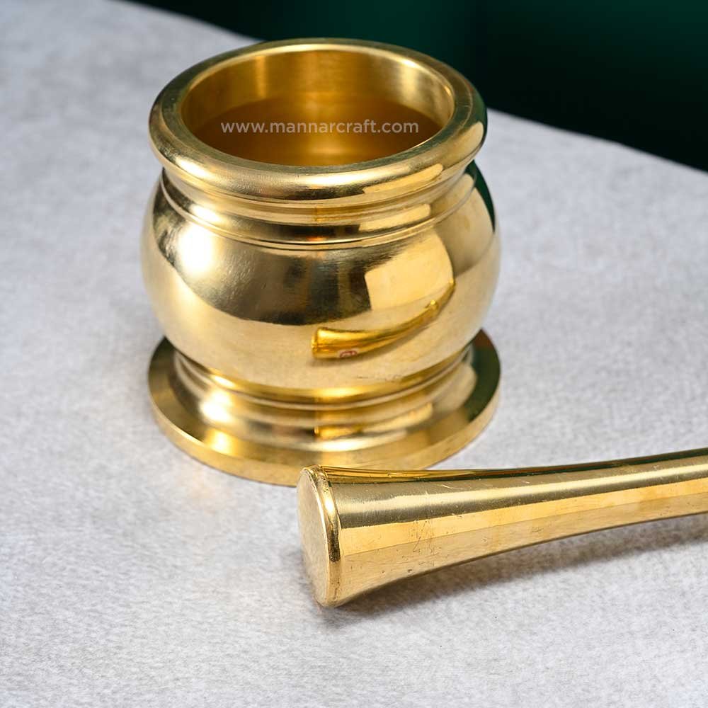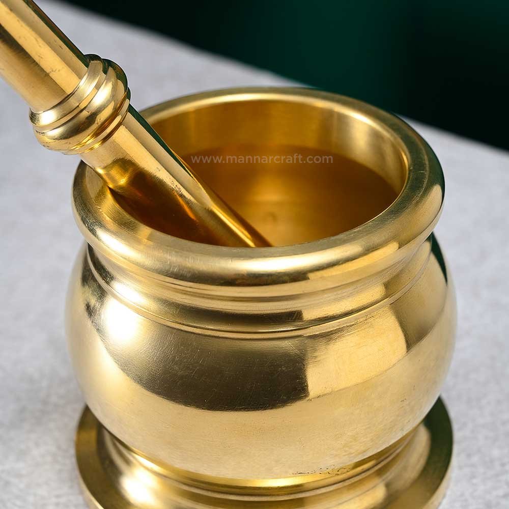 Handcrafted pure brass mortar and pestle by Mannar Craft. Traditional Indian spice grinder for crushing herbs, spices, and seeds with authentic craftsmanship.