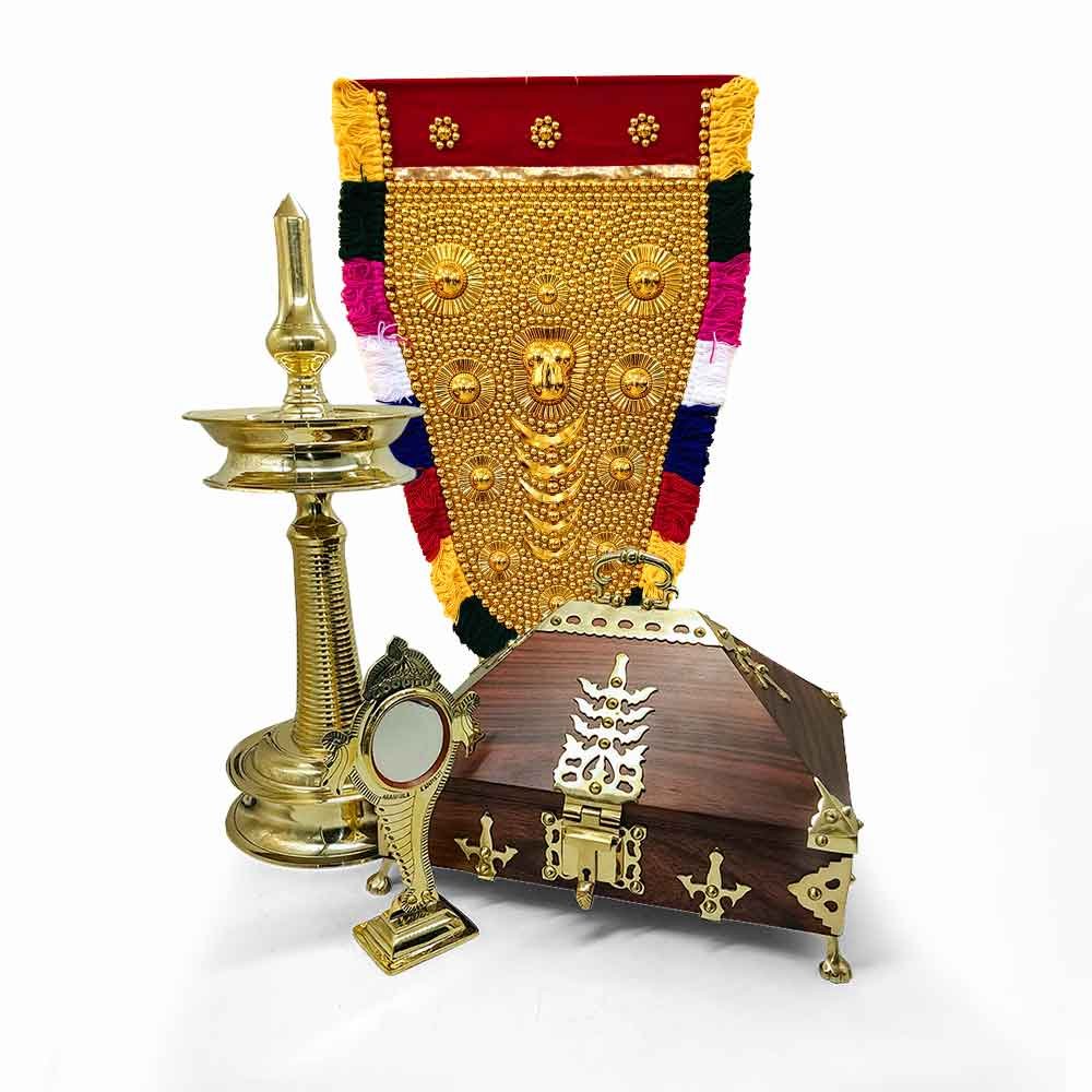 Mannar Craft Onam Special Combo includes Big Nettoor Petti, 2 ft Nilavilakku, Shank Peedom Aranmula Kannadi and 3 ft Nettipattam—premium traditional Kerala gift set.