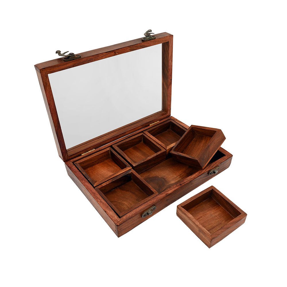 The intricate glass design on the lid of the Spice Box much a good choice of craftsman. It showcases the traditional craftsmanship of Mannar, a city known for its rich cultural heritage. The box is finished with a smooth and polished surface that adds an elegant touch to your kitchen décor.