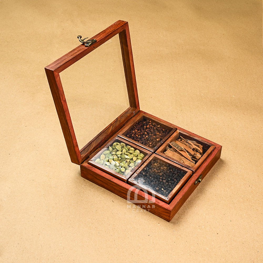 Organize your spices in style with Mannar Craft’s handcrafted wooden masala box featuring 4 partitions and premium spices. A perfect blend of tradition and utility for your kitchen.