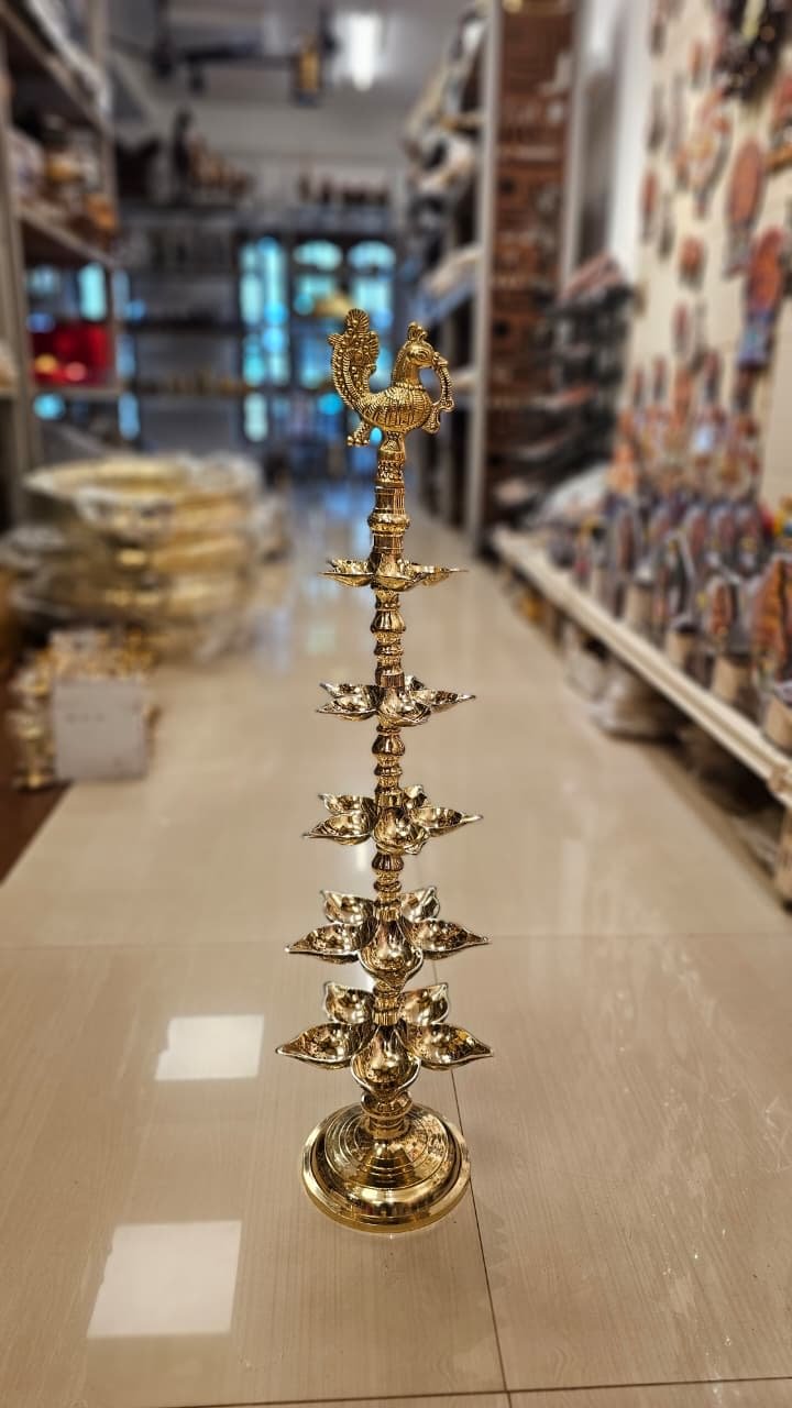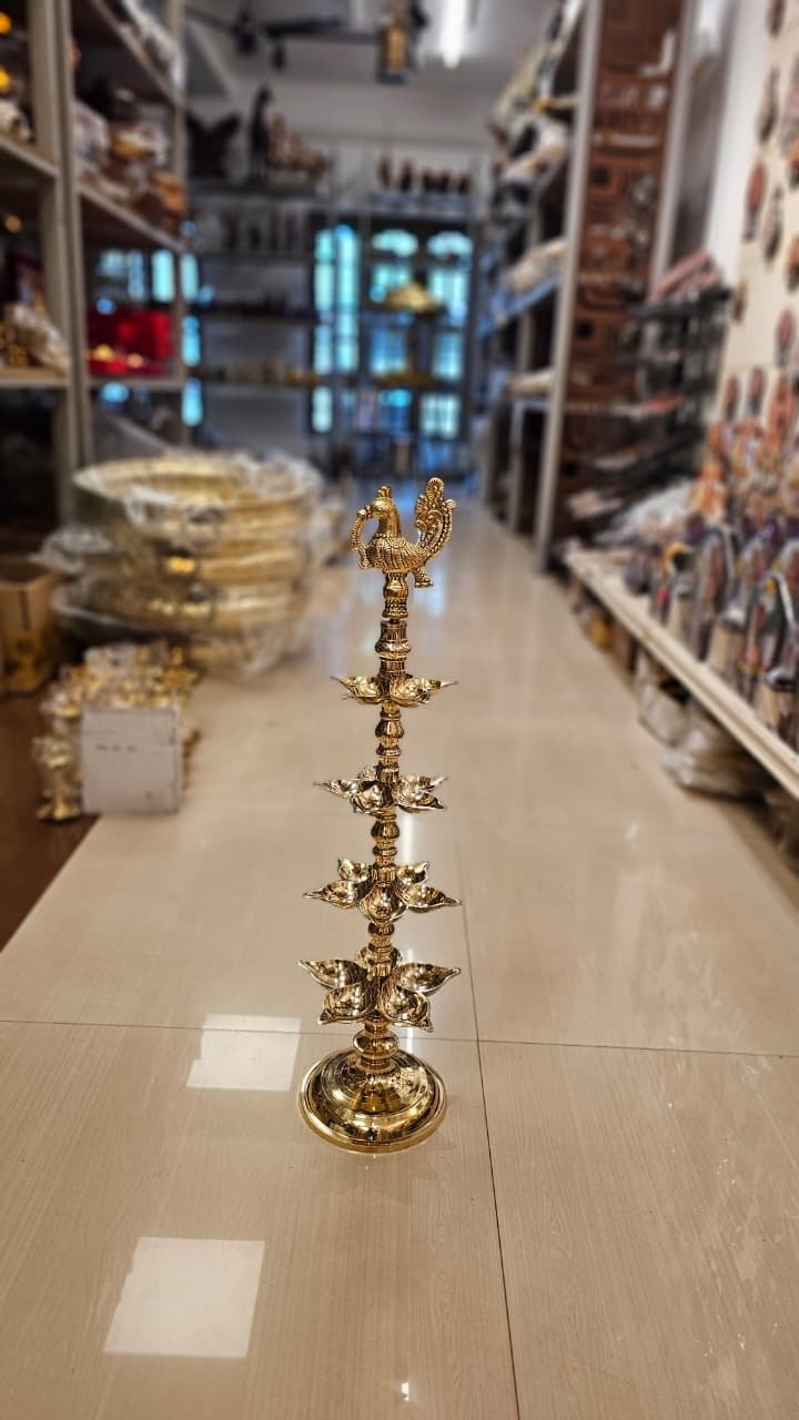 Bring divine elegance home with this handcrafted multi tiered peacock lamp. Made from premium brass, it adds a majestic glow to pooja rooms, festive décor, and traditional interiors.