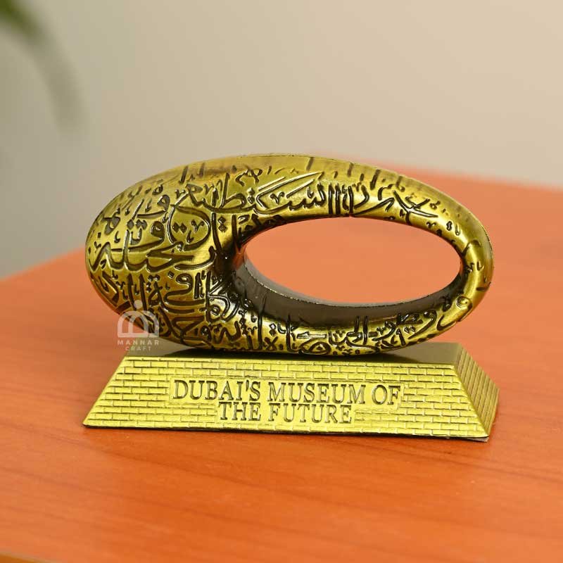 Crafted in an elegant oval-shaped structure, this showpiece showcases intricate Arabic calligraphy engravings, reflecting the philosophy and forward-thinking spirit that the Museum of the Future represents. The polished gold tone adds a luxurious touch, making it instantly eye-catching on desks, shelves, or display units.