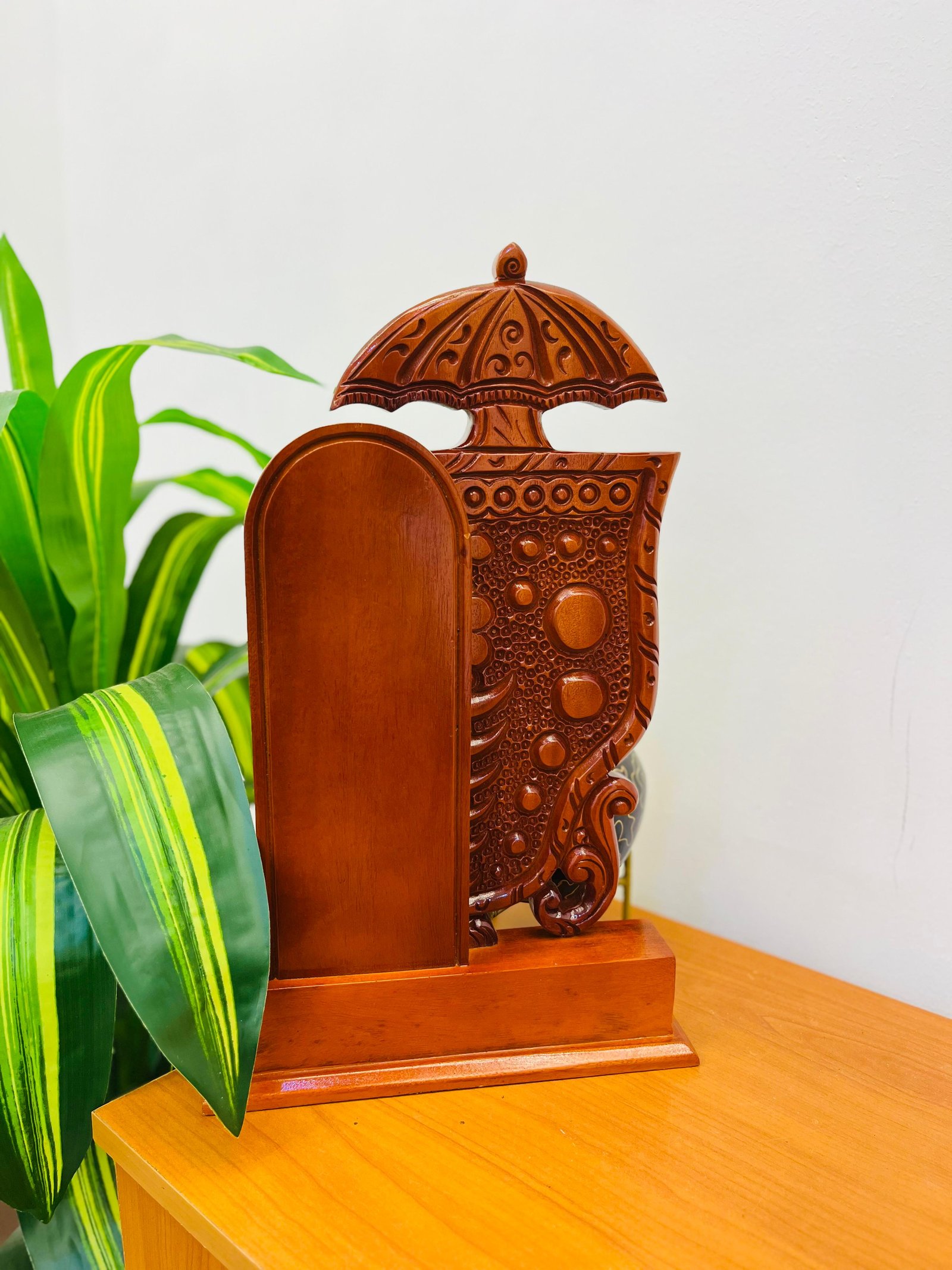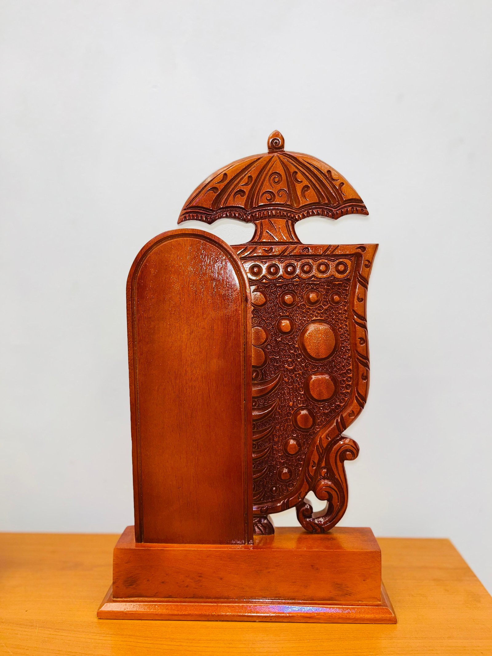 Crafted from quality mahogany wood, this piece captures the majestic symbolism of Kerala temple traditions while adding sophistication to any interior. Whether displayed in living rooms, offices, reception spaces, or pooja rooms, it becomes an instant conversation piece.