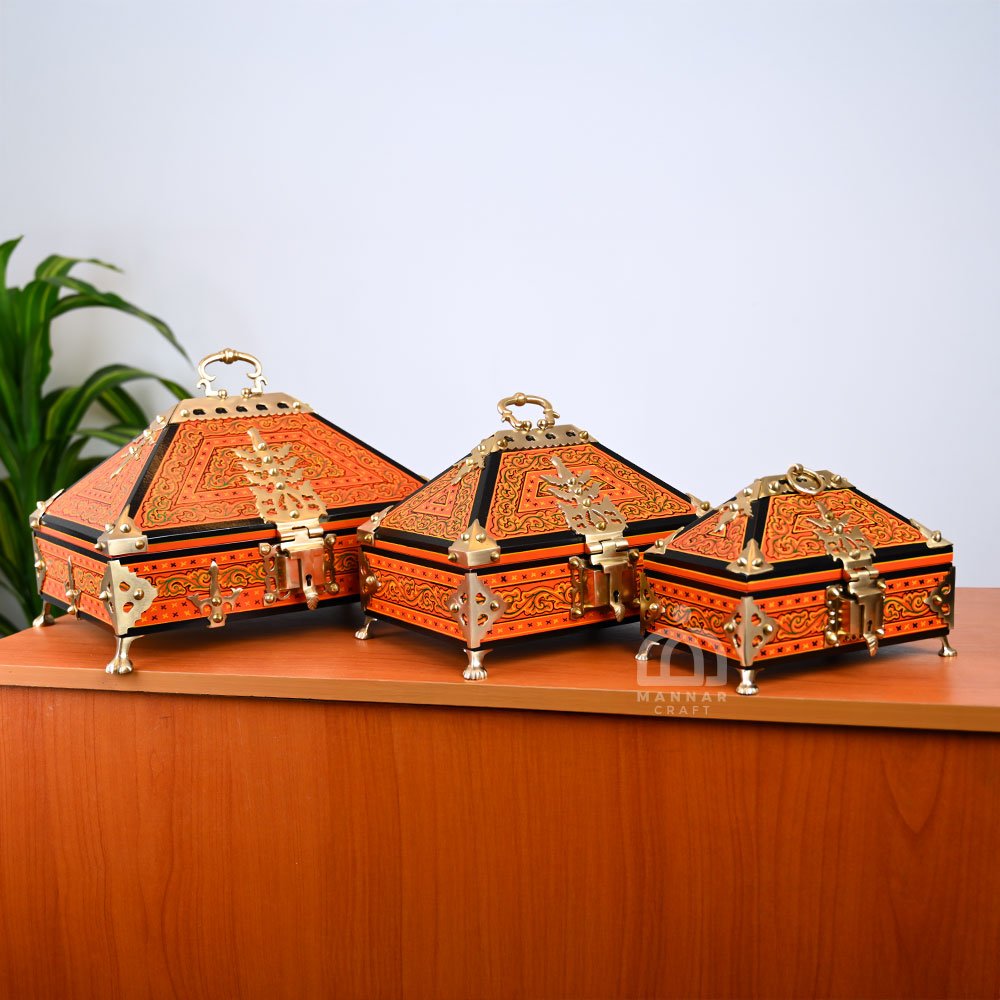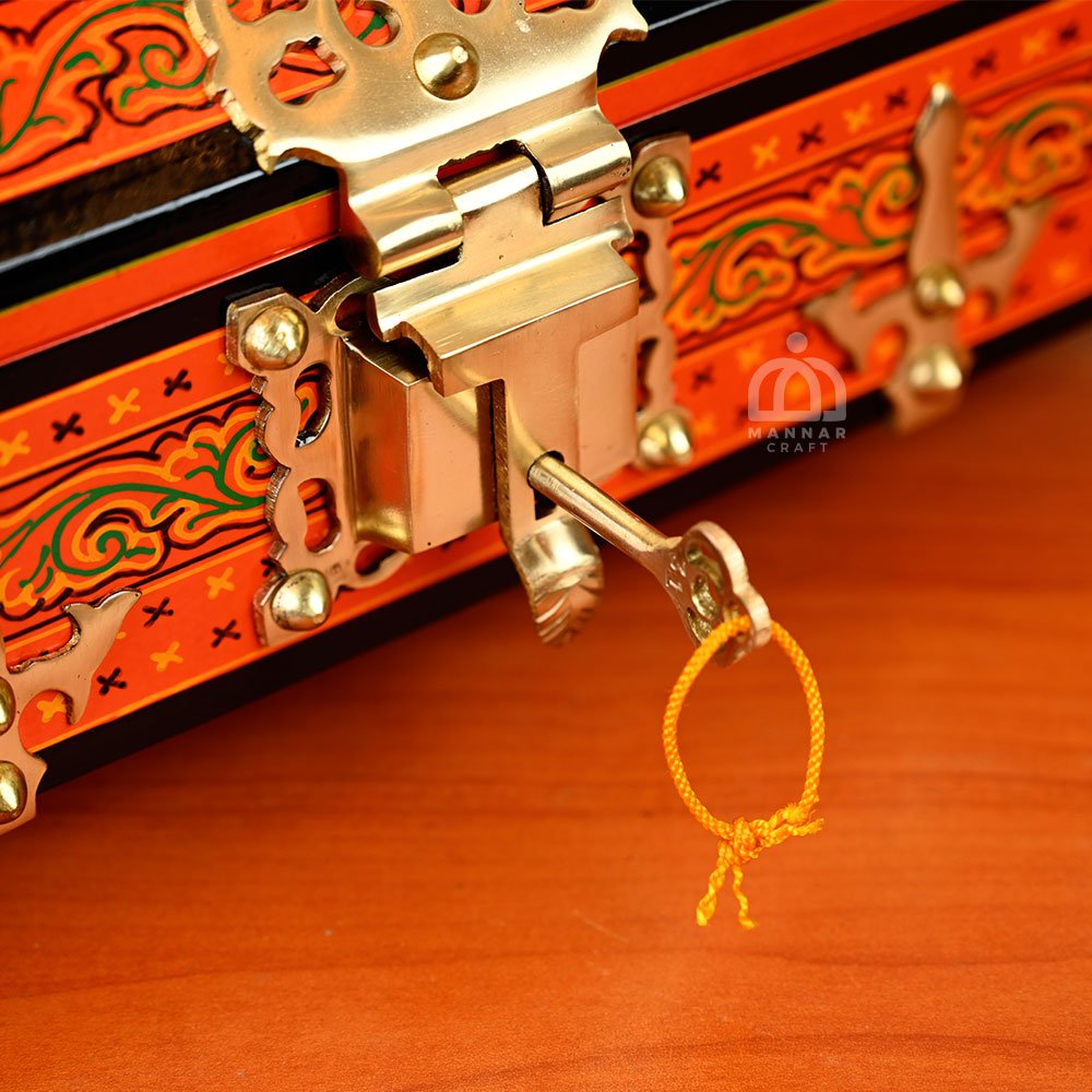 Adorned with vibrant orange mural art, this Baby Nettoor Petti (Mahogany Amadapetti) is a miniature masterpiece of Kerala craftsmanship. Ideal as a jewel box, keepsake chest, or traditional décor piece for your home.